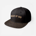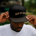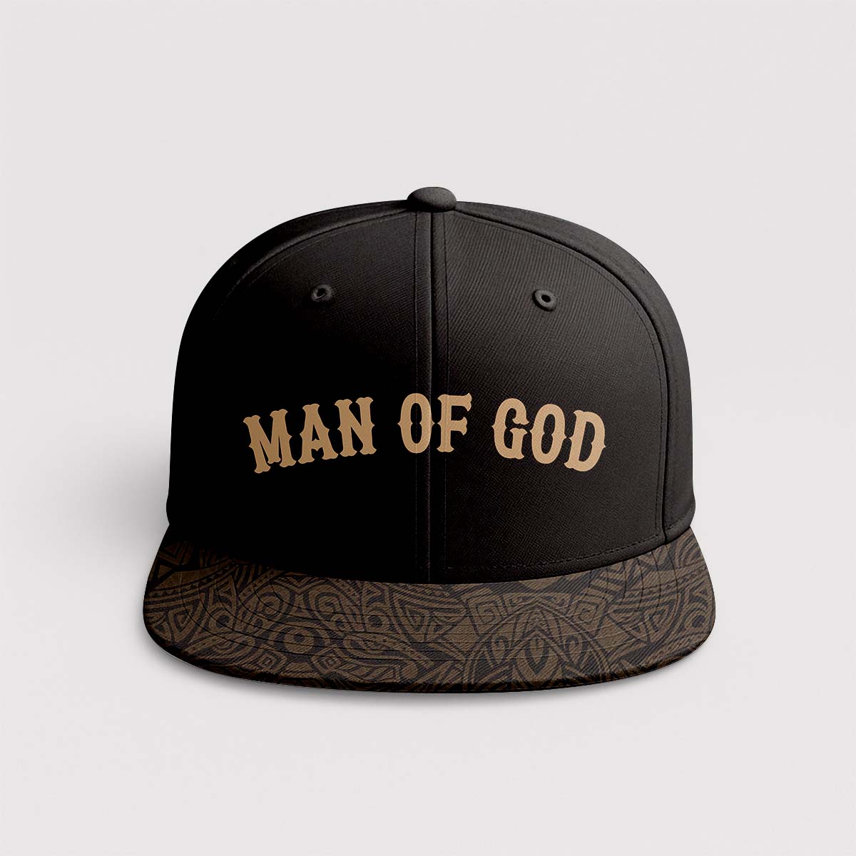 A deep-black, structured crown hosts bold antique-gold lettering that curves with quiet authority: MAN OF GOD. The flat bill finishes the sermon in style, cloaked in a tonal tribal pattern that whispers warrior roots with every tilt.