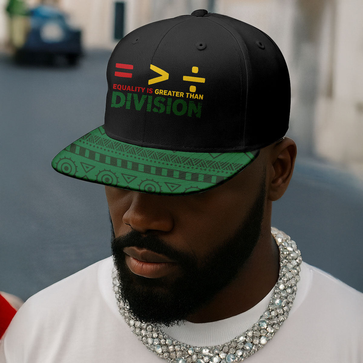 Embroidered with the bold symbol “EQUALITY > DIVISION” in gold thread across the front, this cap turns a simple equation into a powerful message. With a sleek black crown and subtle red, black, and green accents, it carries both cultural pride and a call for justice.