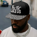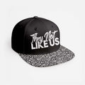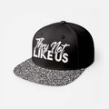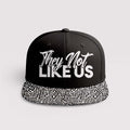 The They Not Like Us Snapback Hat features bold white lettering on a sleek black crown, paired with a striking tribal-patterned brim that demands attention. It’s more than a look — it’s a mindset.