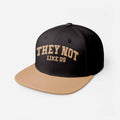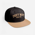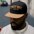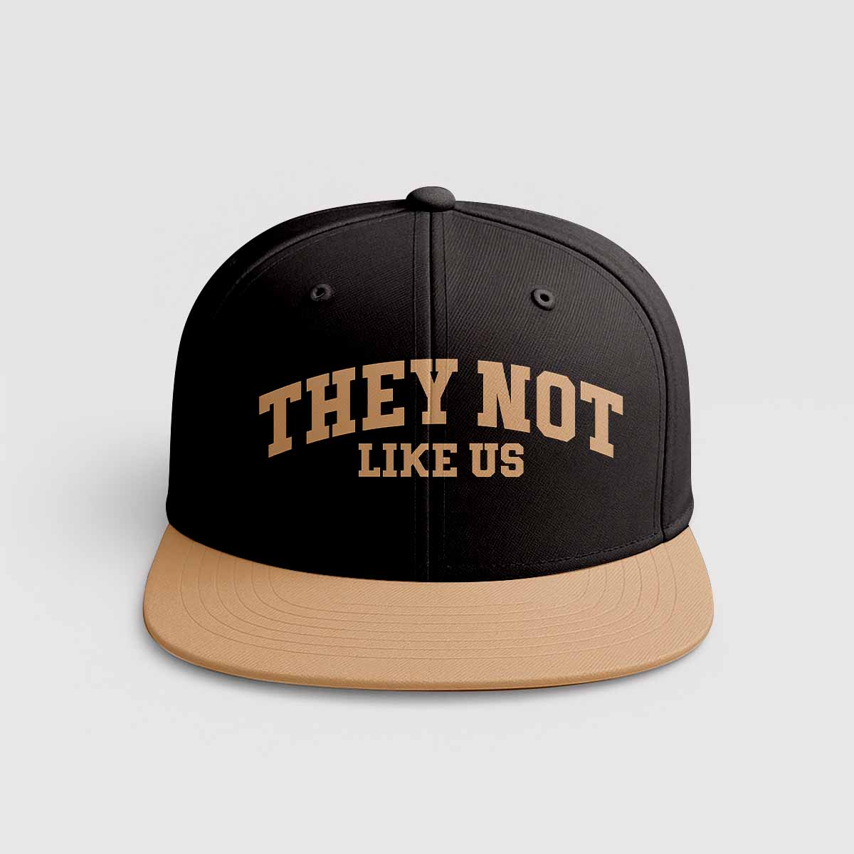 A deep-black, six-panel crown sets the tone, while a smooth sand-tan flat bill throws perfect contrast. Front and center, THEY NOT LIKE US arches in bold vintage-cream lettering—loud enough that nobody mistakes where you stand. Each stitch stays tight, each eyelet lets the heat out, and the snapback closure locks in a just-right fit from fresh fade to full locs.