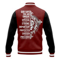 Front (Jacket): Classic varsity silhouette with striking “BLESSED & BOLD” lettering — a statement of strength, courage, and divine favor.