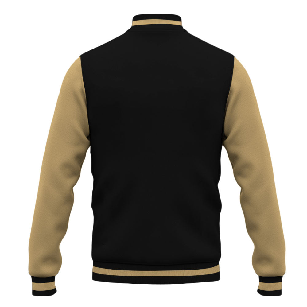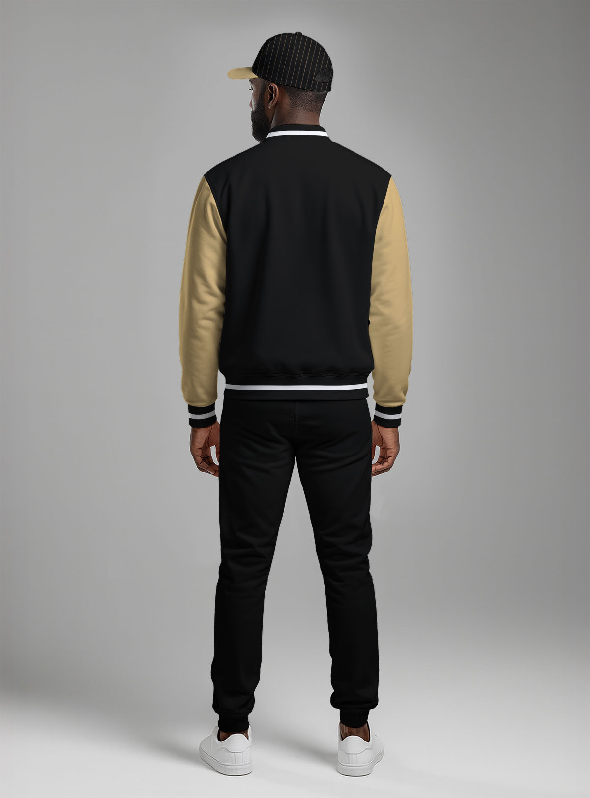 Design: Deep black body with rich purple and gold contrast sleeves — colors that embody royalty, pride, and excellence. Every detail is designed to make your fit stand tall.