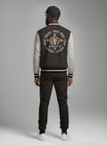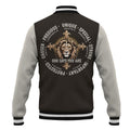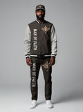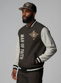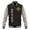 Front (Jacket): Classic varsity silhouette with bold “MAN OF FAITH” lettering — declaring strength, courage, and unshakable belief.