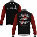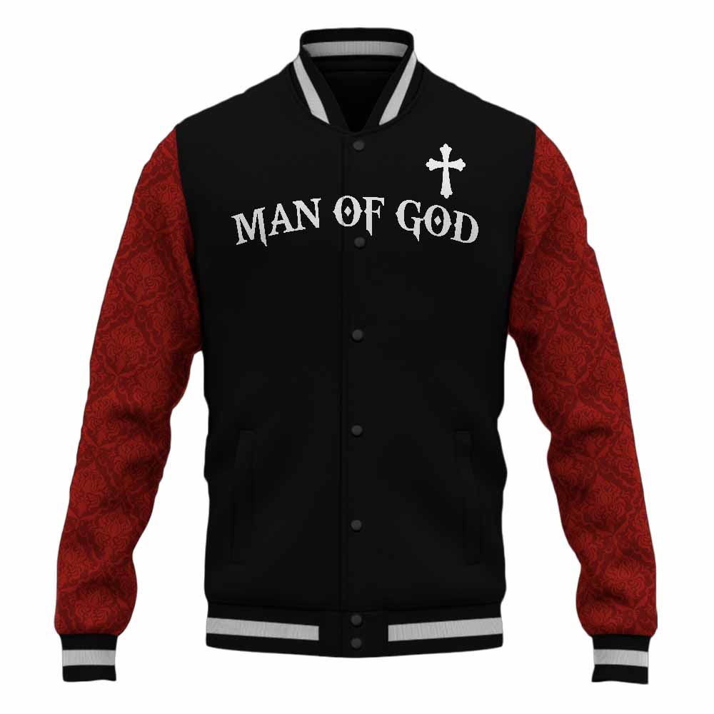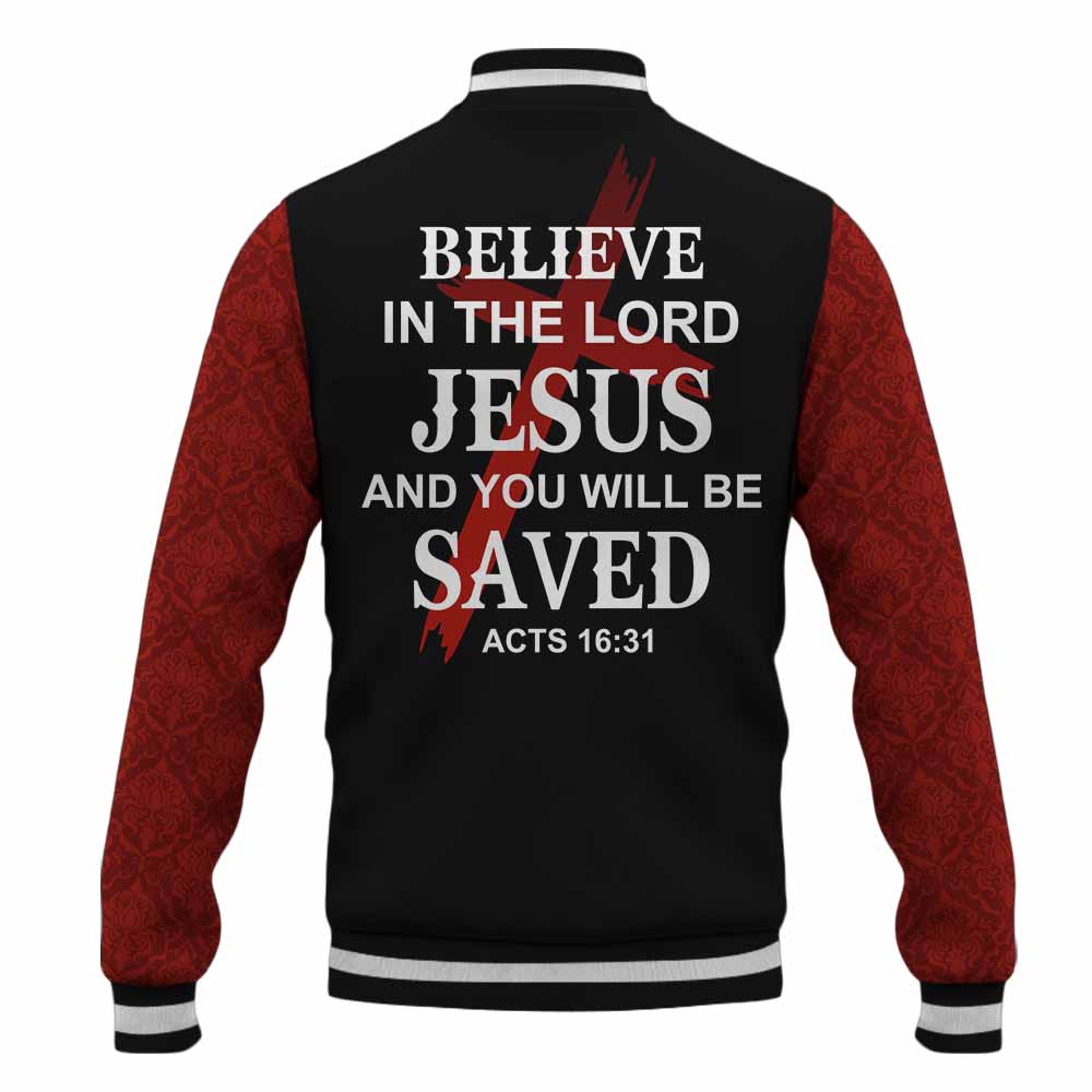 Front (Jacket): Classic varsity silhouette with striking “SALVATION” lettering — a powerful statement of freedom and redemption through Christ.