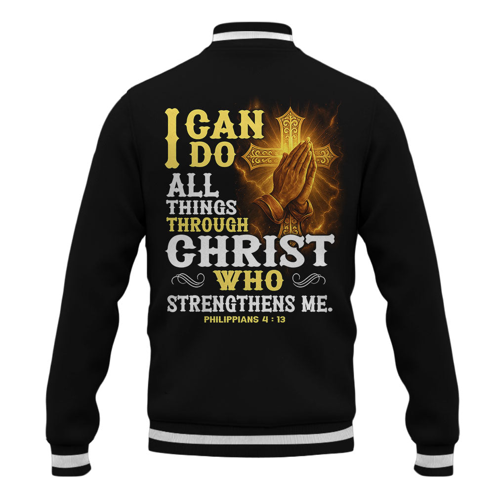 Strength in faith. Victory in Him. The “Through Christ” varsity jacket is a bold declaration of Philippians 4:13 — “I can do all things through Christ who strengthens me.”