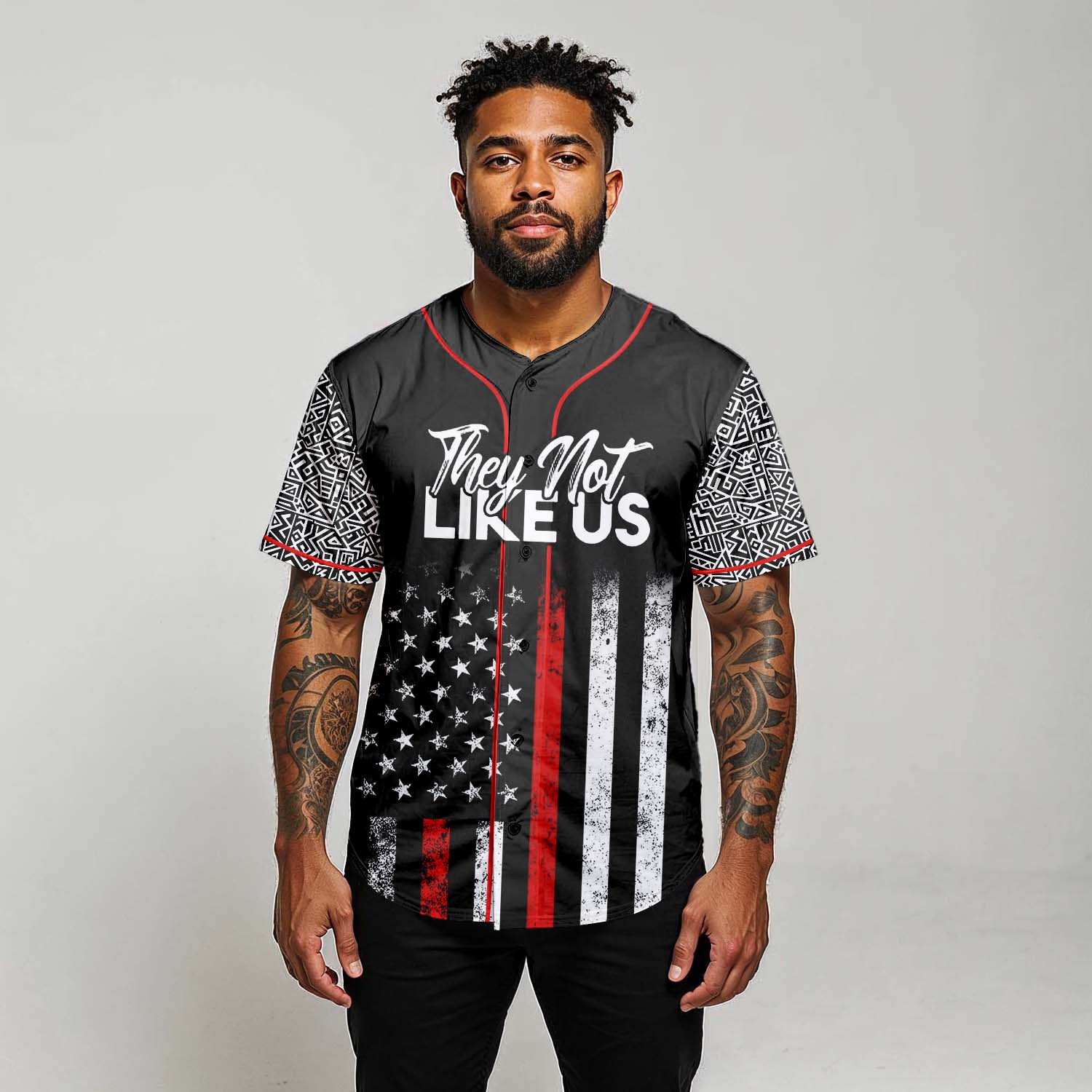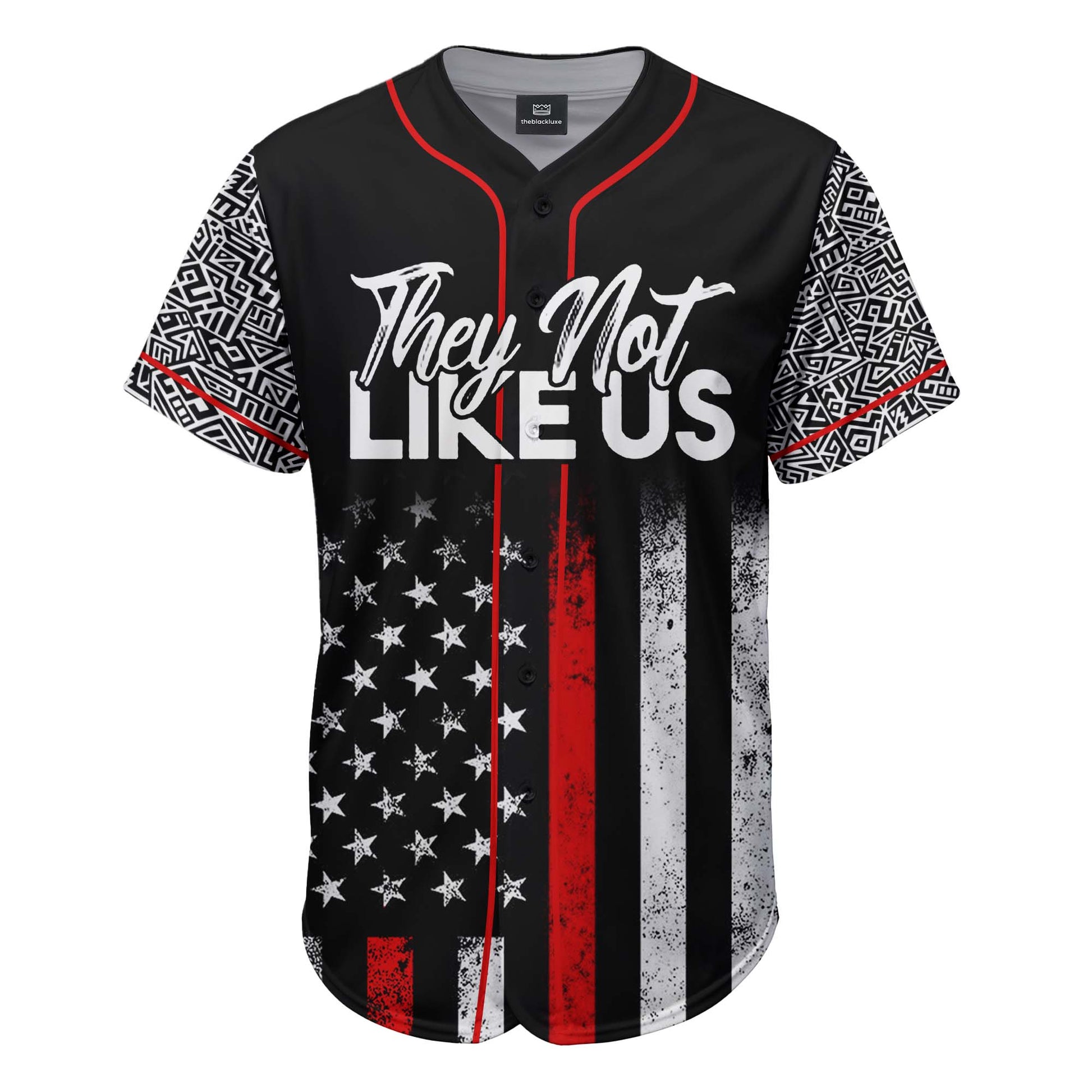 Jet-black body streaked with a battle-worn flag and a single red lifeline down the center. Geometric sleeve tapes salute deep-rooted heritage, while the chest script warns every doubter in bold white: THEY NOT LIKE US. Turn around and the truth hits harder—“I DIDN’T CHOOSE TO BE BLACK, I JUST GOT LUCKY.” Pride, gratitude, and unbreakable confidence stitched into every fiber.