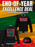 🧥 Jacket Design: Jet-black body with white contrast sleeves and radiant gold “BLACK EXCELLENCE” lettering across the chest. A regal African crown-and-star emblem on the back symbolizes heritage, royalty, and divine purpose.