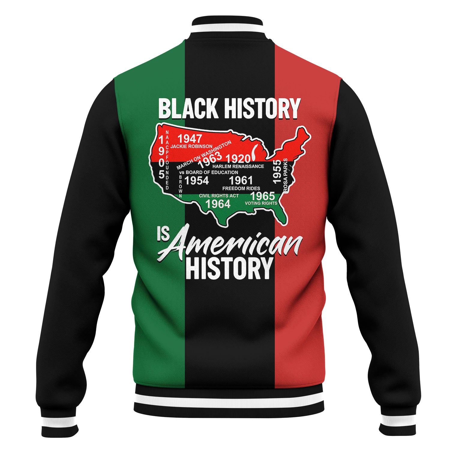 🧥 Jacket Design: A deep-black varsity body paired with crisp white sleeves, featuring commanding gold “PRIDE & LEGACY” lettering across the chest. On the back, a powerful heritage crest with raised fists, cultural icons, and a regal crown symbolizes resilience, triumph, and the unbreakable story of Black achievement.