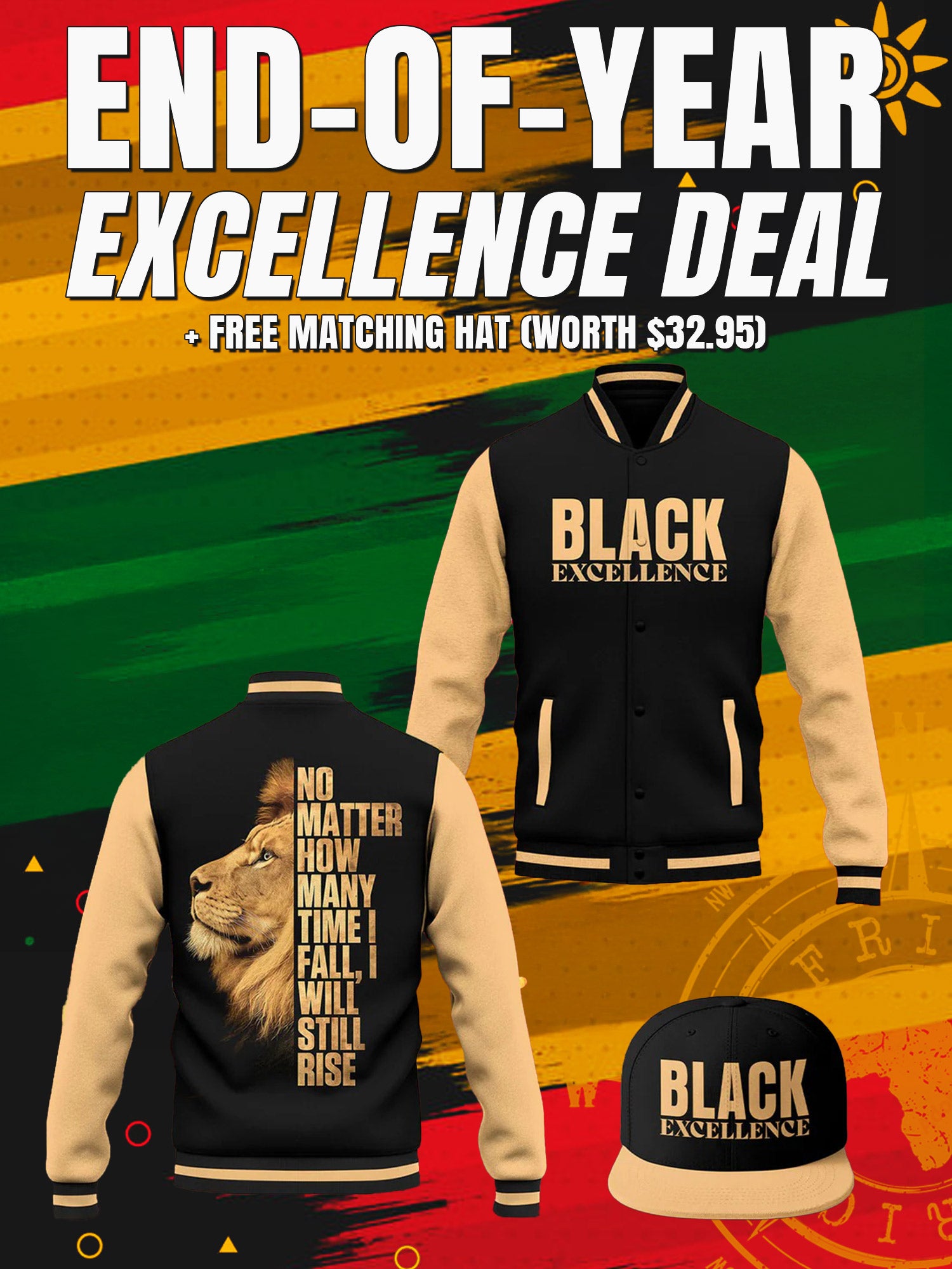 🧥 Jacket Design: A deep-black varsity body with crisp white sleeves, featuring bold gold “STILL I RISE” lettering across the chest. On the back, a fierce heritage crest with raised fists, cultural symbols, and a radiant crown represents victory through struggle and the unstoppable spirit of Black resilience.