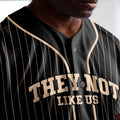 Black fabric etched with crisp cream pinstripes frames the front’s bold creed: THEY NOT LIKE US in heavyweight block letters that refuse to blend in. Turn around and you’ll see a clenched fist burning bright, ringed by the rallying words A FREE MAN WALKS WITH PURPOSE—NOT PERMISSION. Every stripe, every letter, every brush-stroke of that fist is printed to stay loud through countless spins in the wash and miles on the streets.