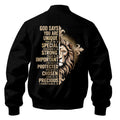 Fit: Classic bomber silhouette with ribbed cuffs, full zip closure, and a soft inner lining. Designed for everyday comfort with a commanding, confident look that blends faith and style effortlessly.