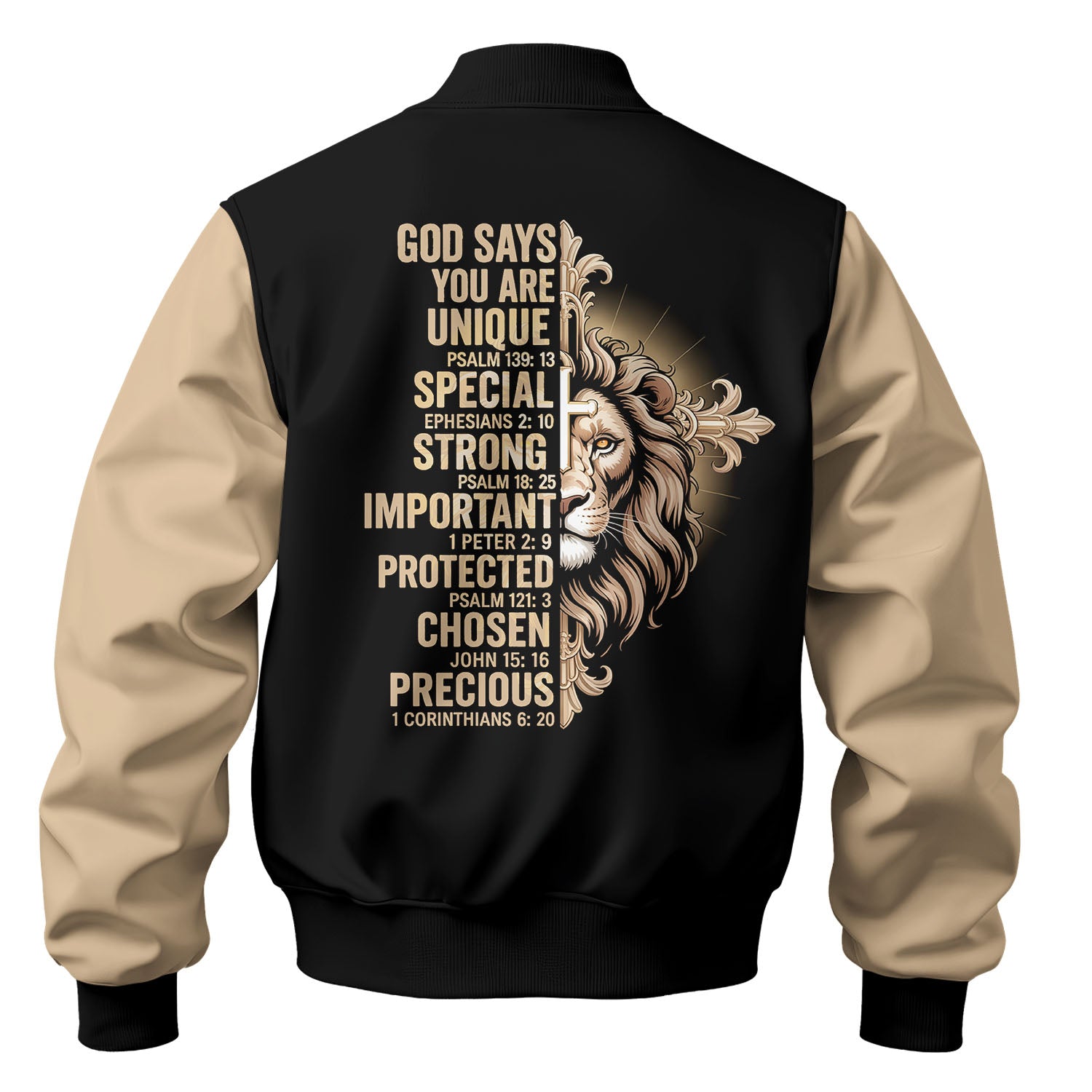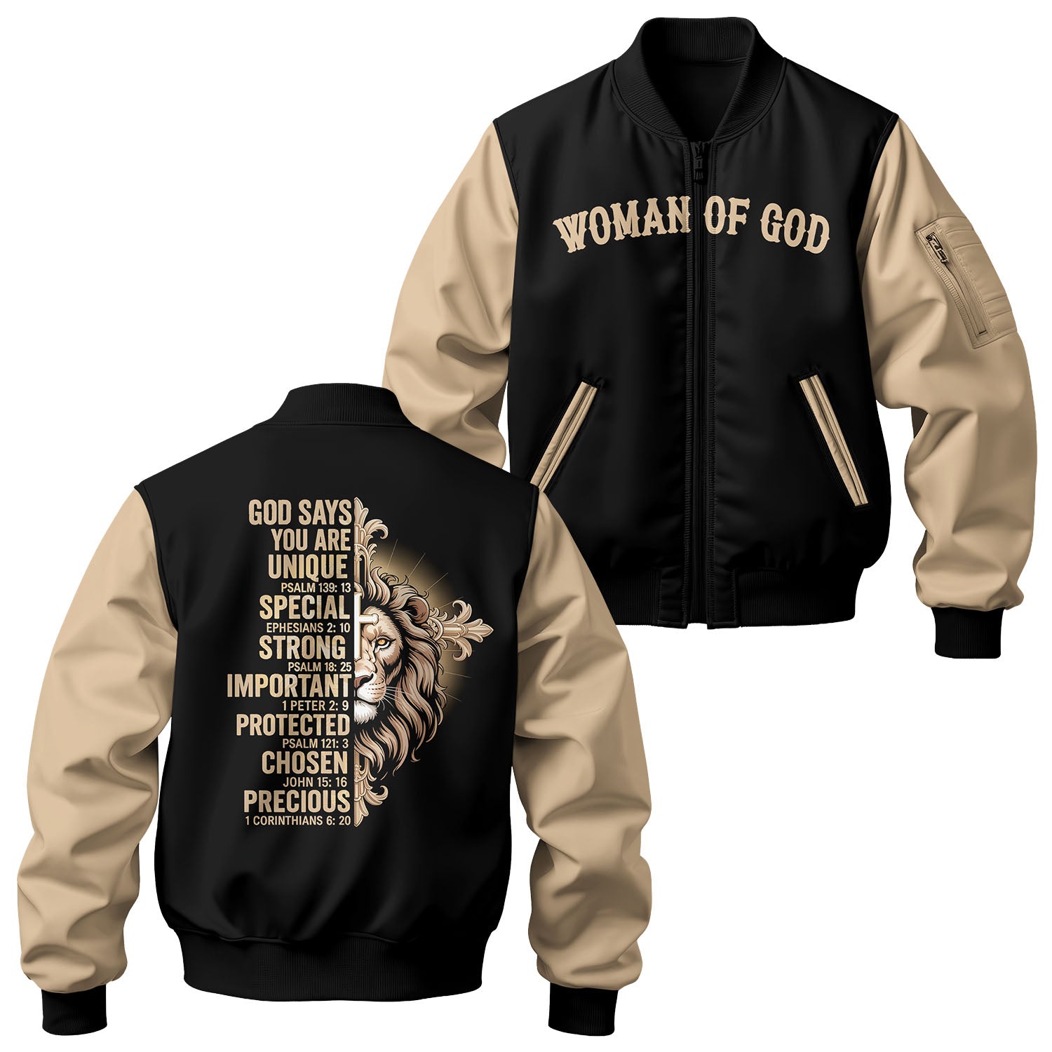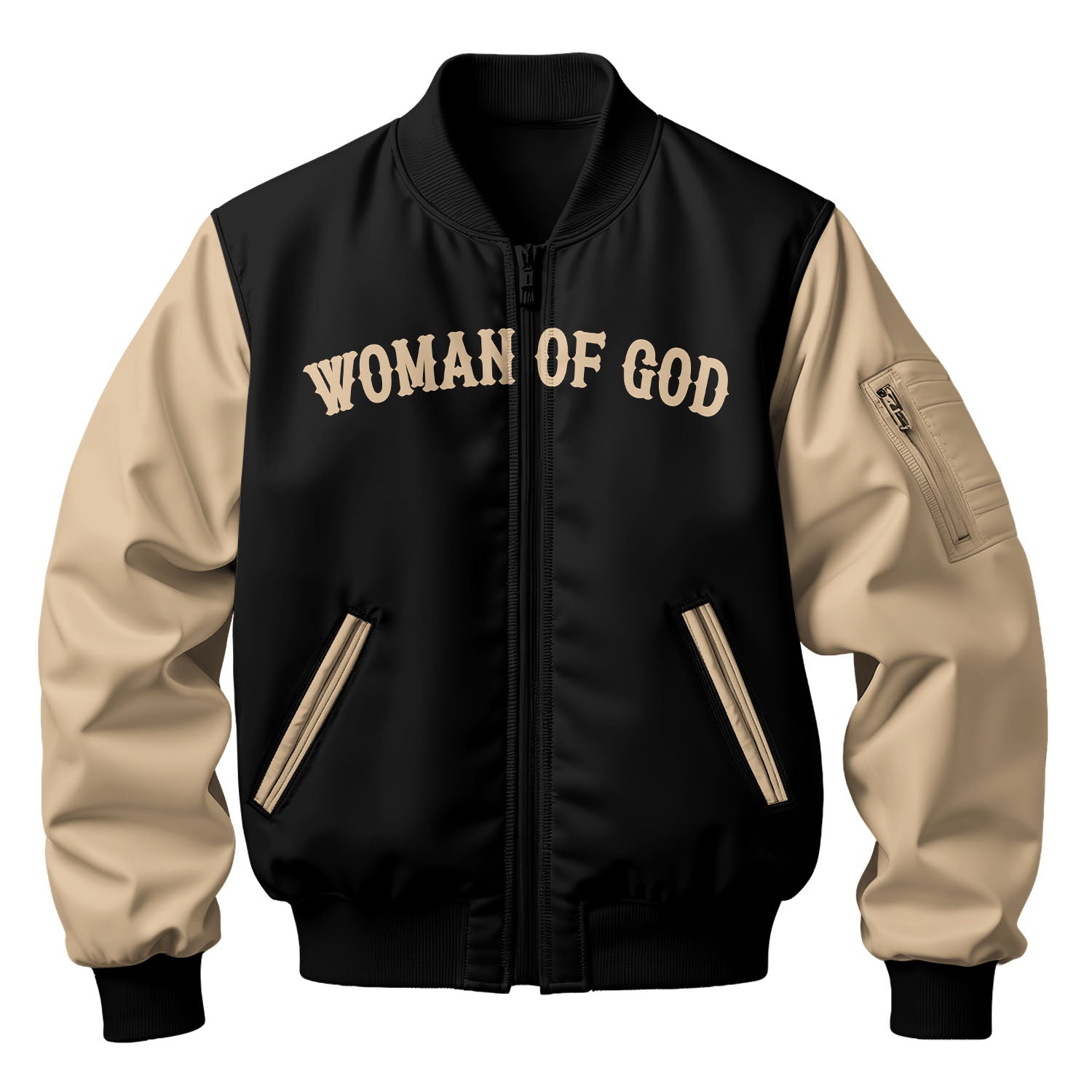 The “Woman of God” Bomber Jacket was created for the women who walk boldly in purpose — radiant, resilient, and rooted in God’s love. It’s more than fashion; it’s a declaration of divine identity.