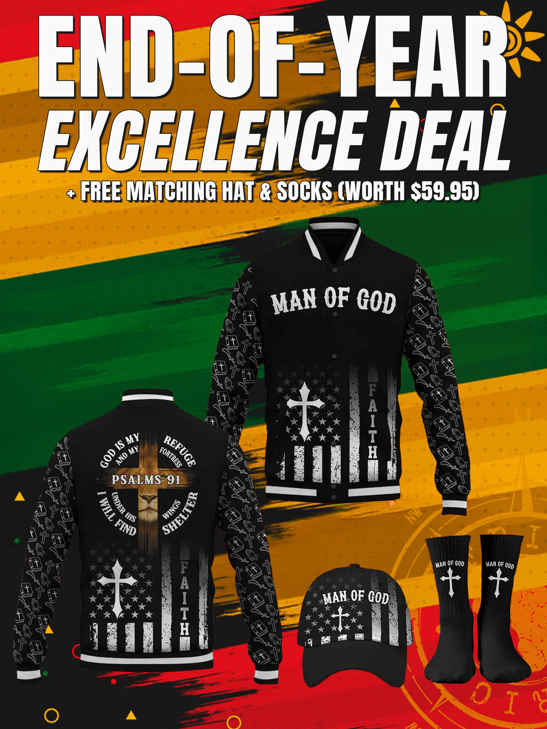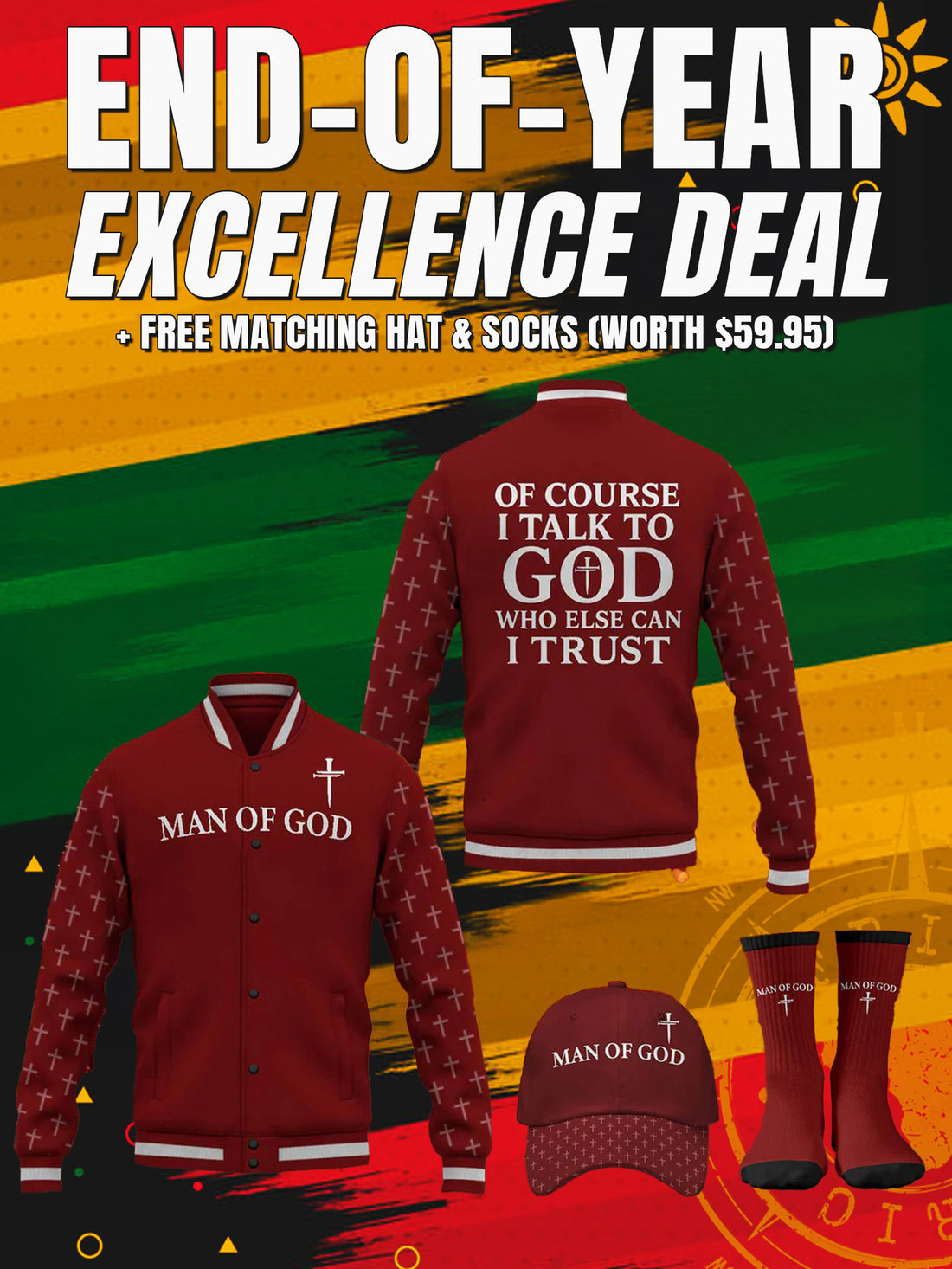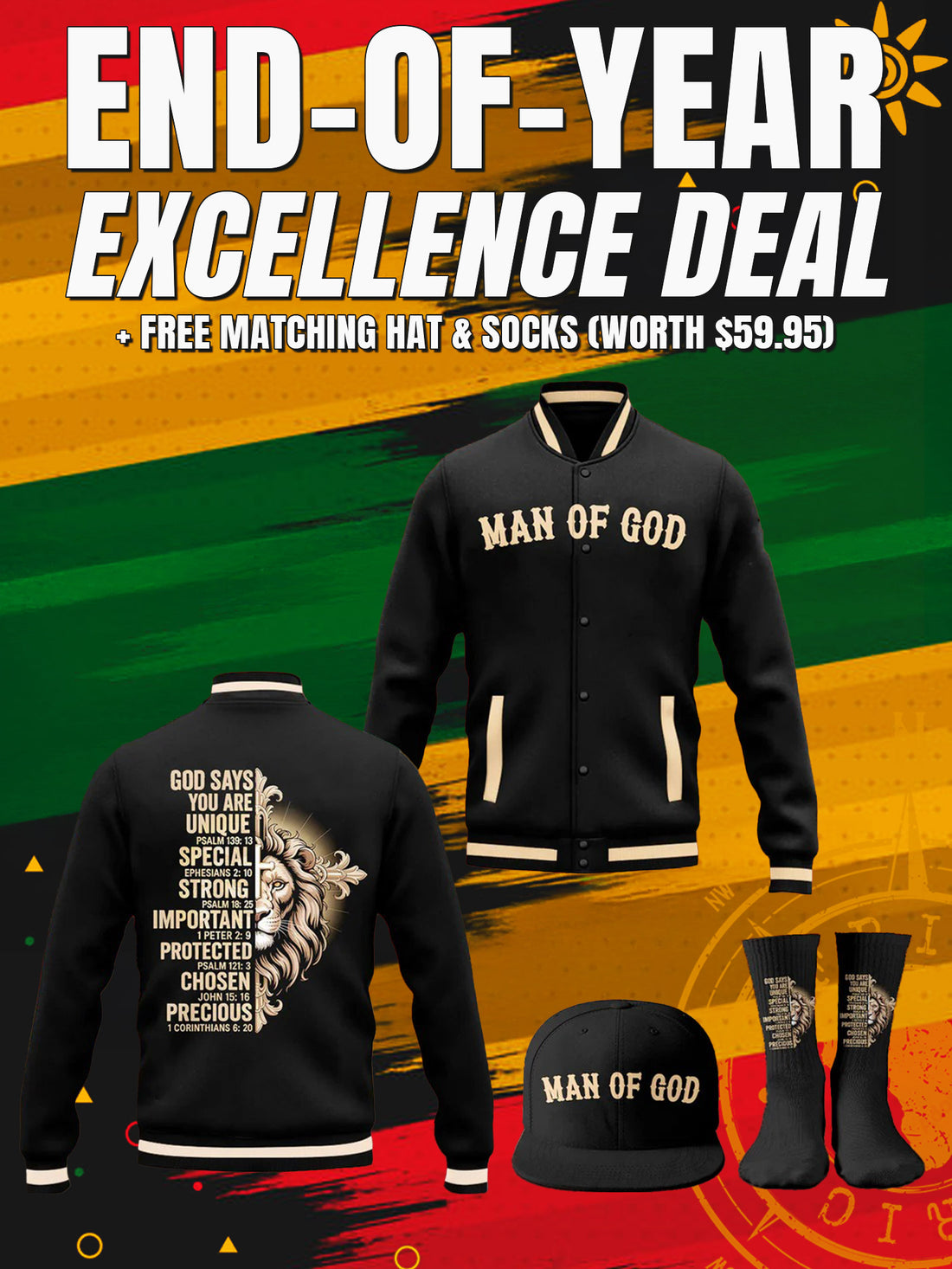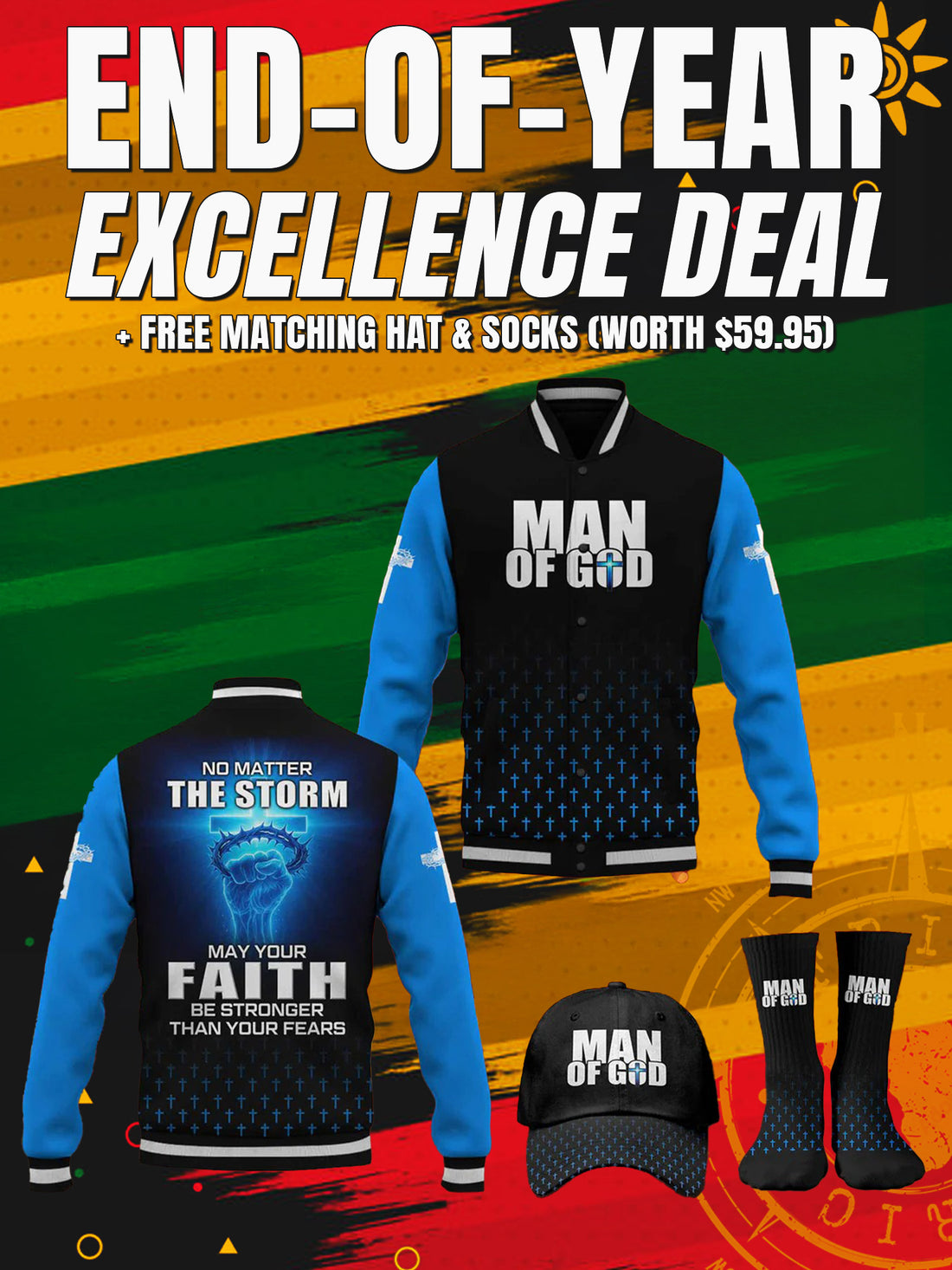 "Man of God" Black Gold Baseball Jacket Christmas Miracle Bundle