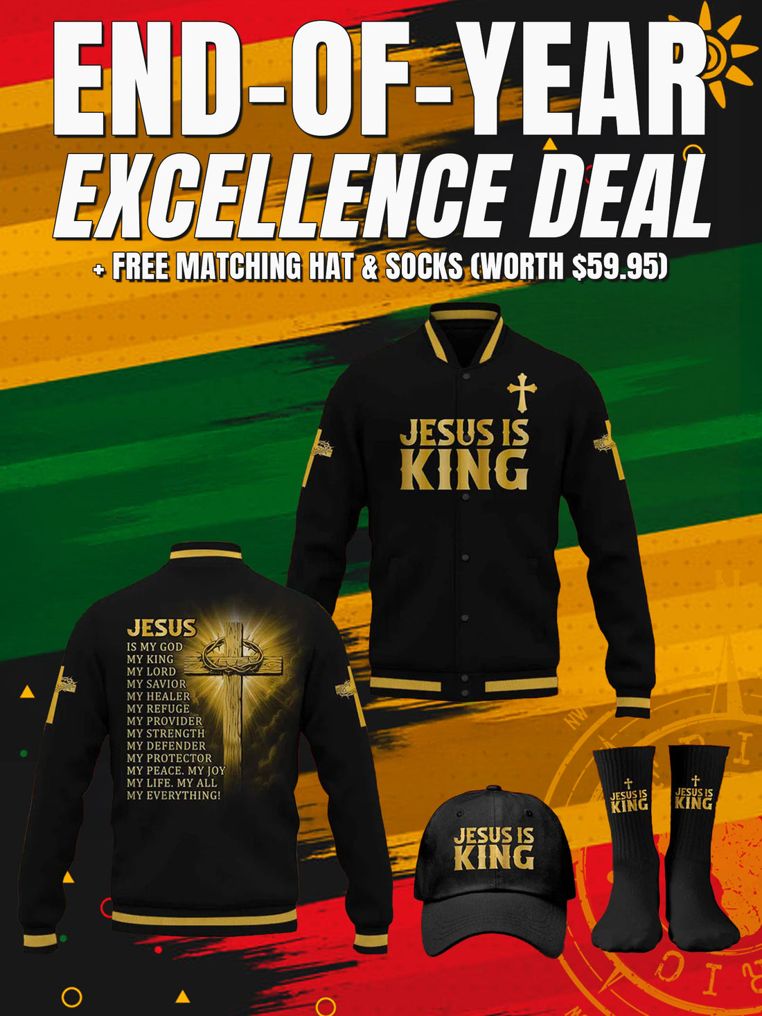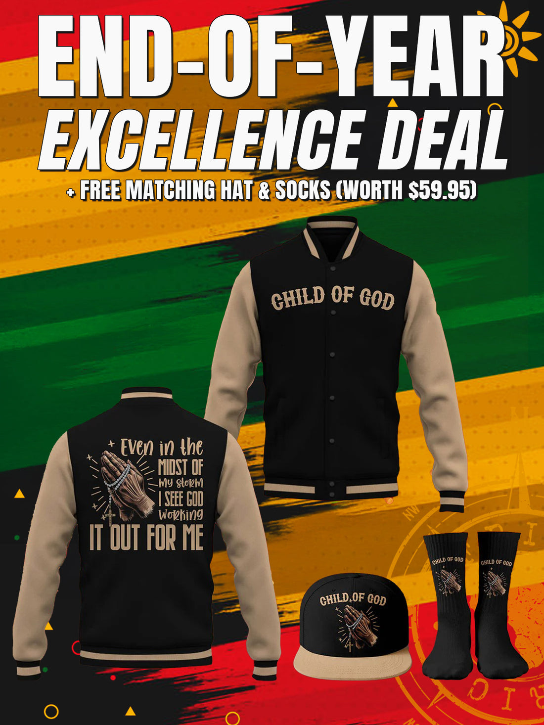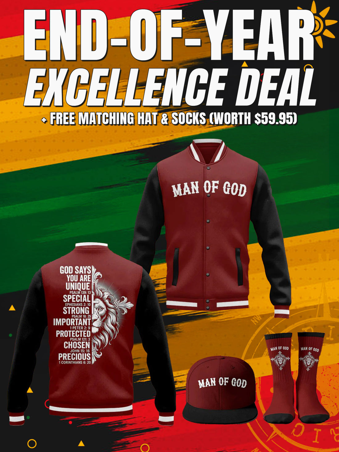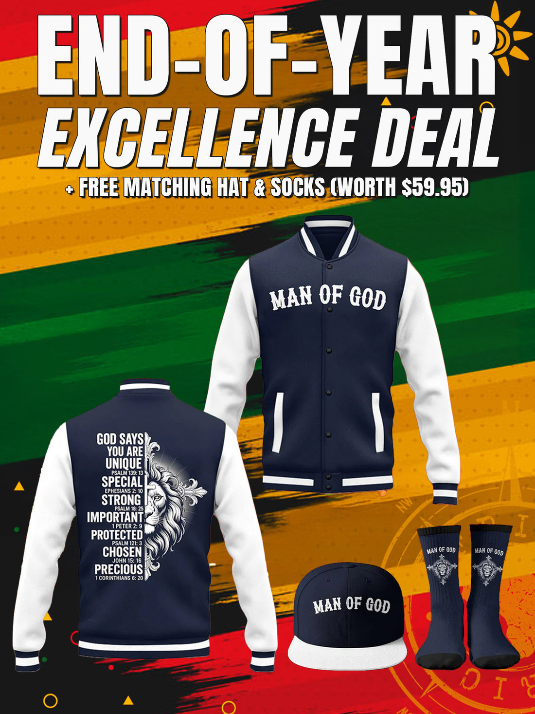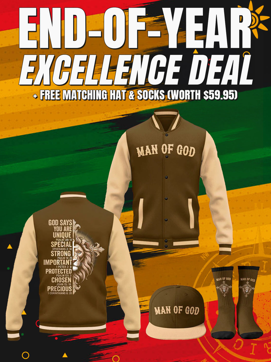 "Man of God" Black Gold Baseball Jacket Christmas Miracle Bundle