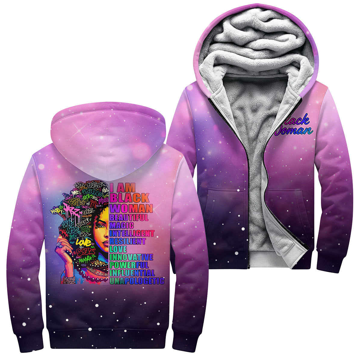 Design: Deep black fleece with clean white âBLACK WOMANâ lettering across the chest â bold, timeless, and full of pride.