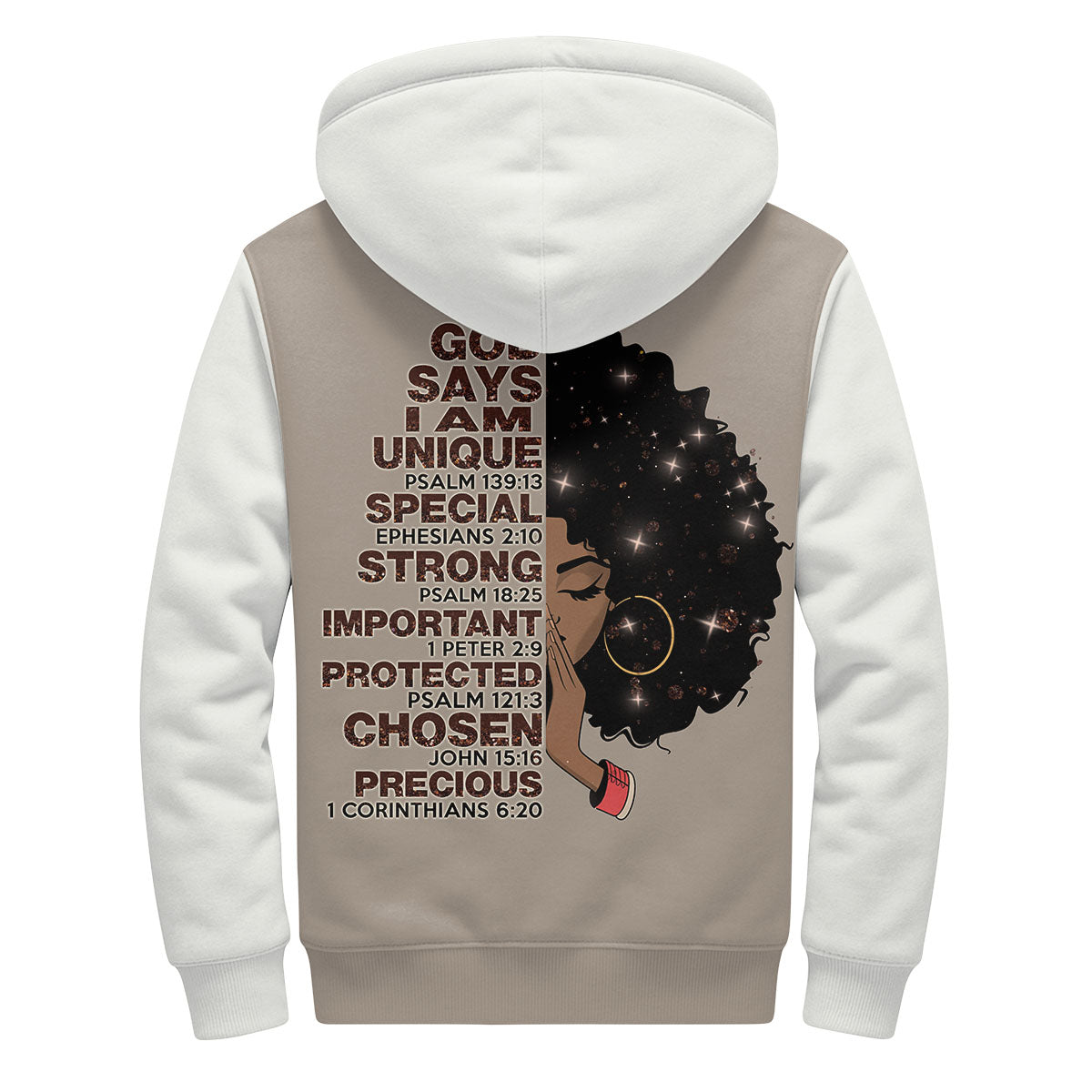 Design: Deep black fleece with bold white “GOD SAYS YOU ARE” lettering across the chest — simple, timeless, and full of truth.