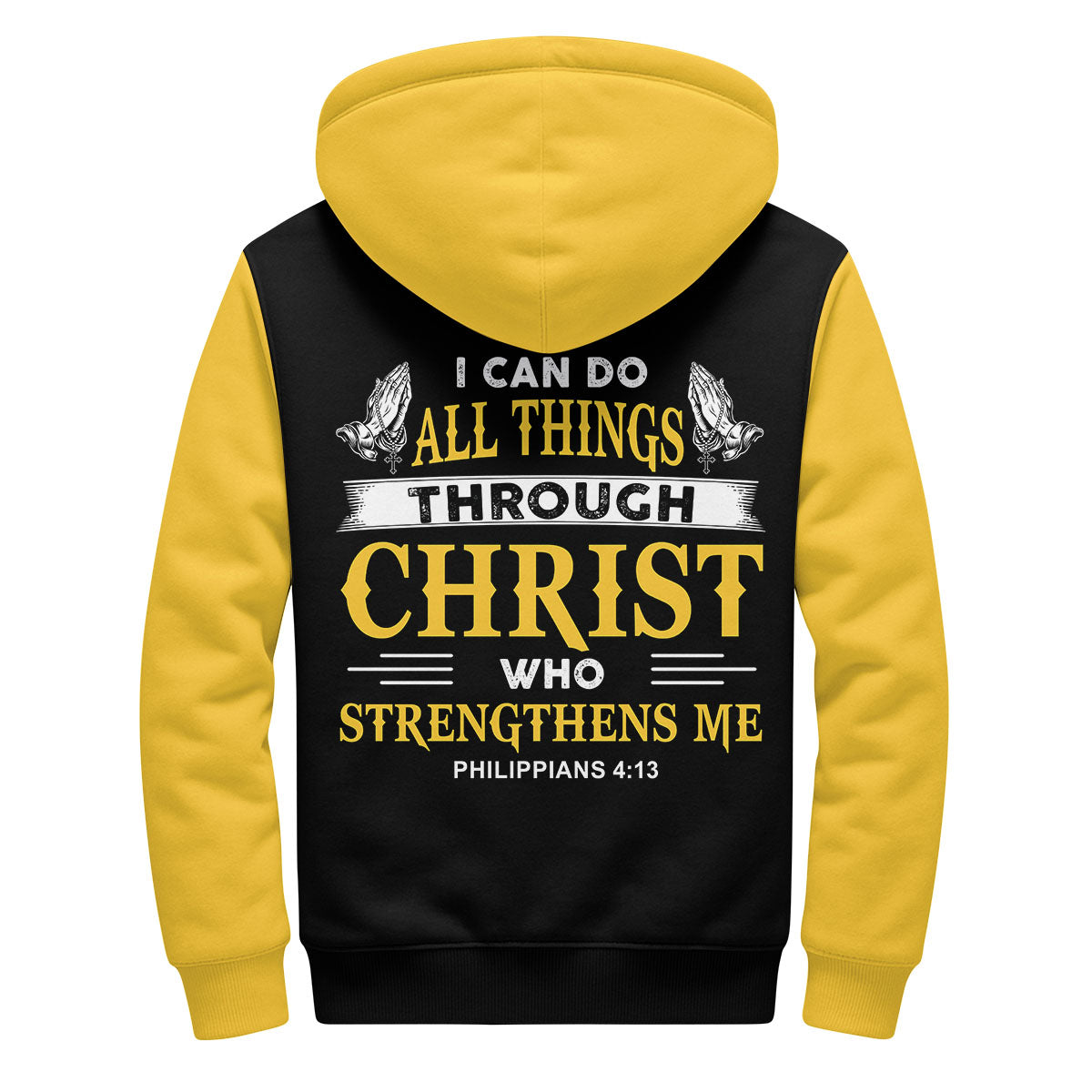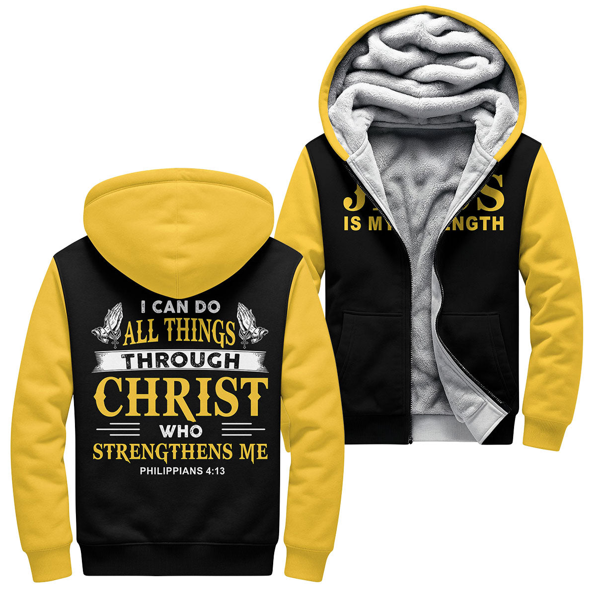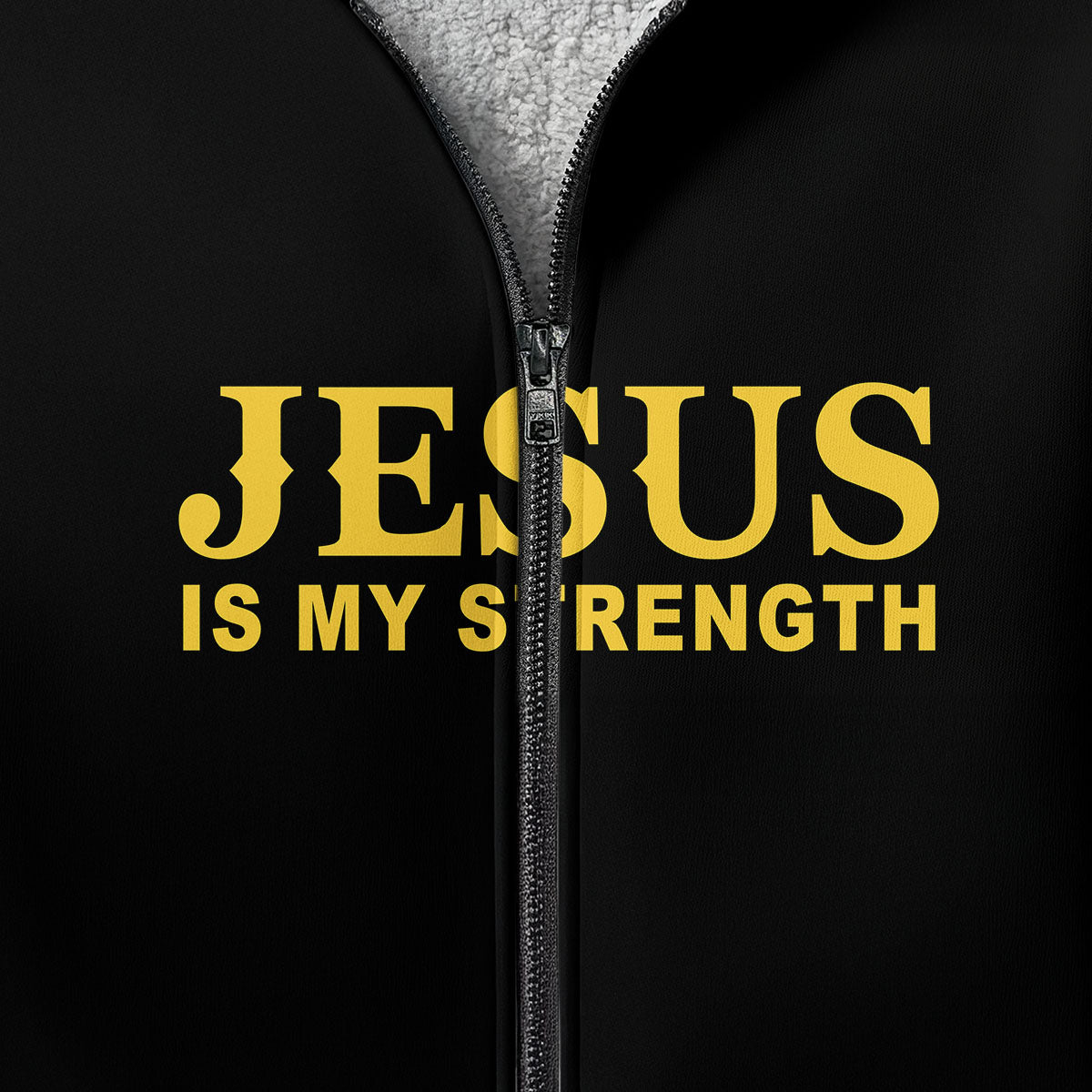 Design: Deep black fleece with bold white “STRENGTH” lettering across the chest — clean, timeless, and full of conviction.