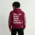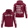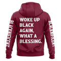 A deep-crimson canvas trimmed with bold tribal tape shoulders frames the proud front arc: BLACKNIFICENT. Spin around and the back proclaims what we all feel—“WOKE UP BLACK AGAIN, WHAT A BLESSING.” It’s gratitude, confidence, and quiet defiance in one breath.
