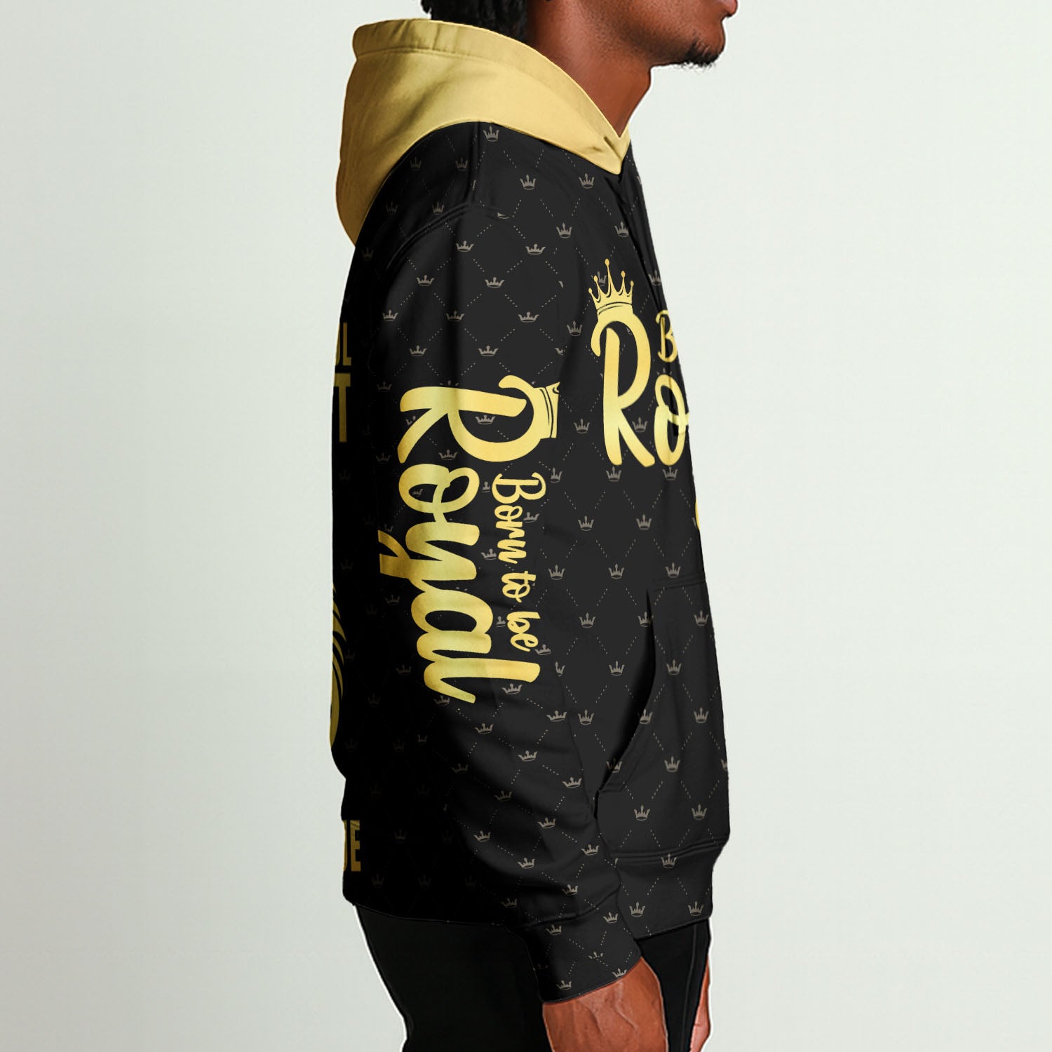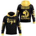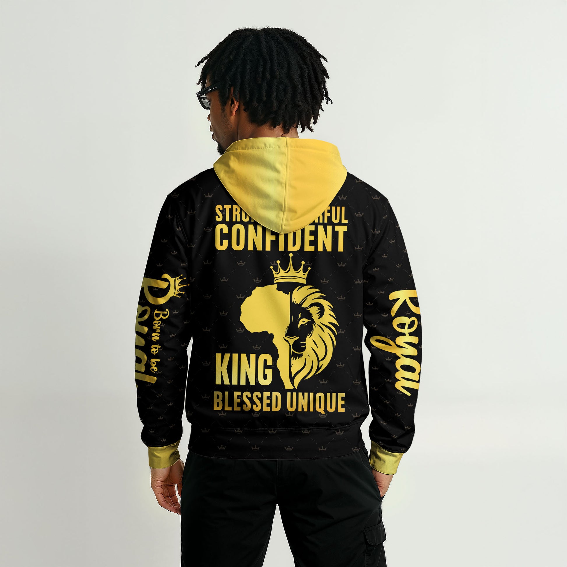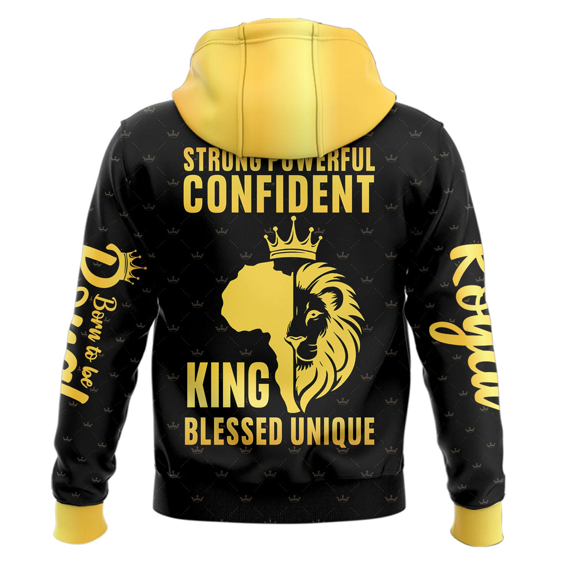 Front print: “STRONG. POWERFUL. CONFIDENT. KING. BLESSED. UNIQUE.” in gold