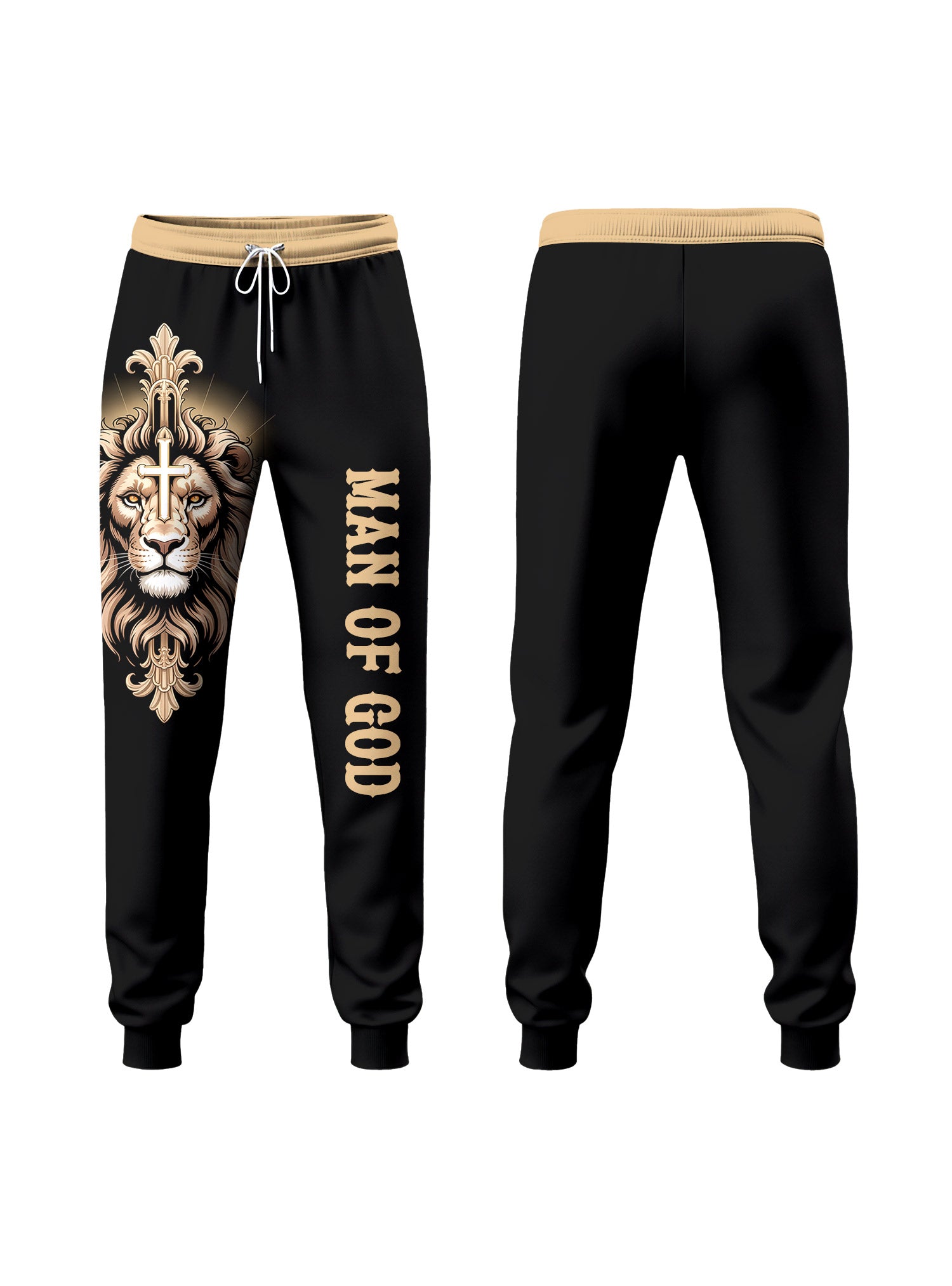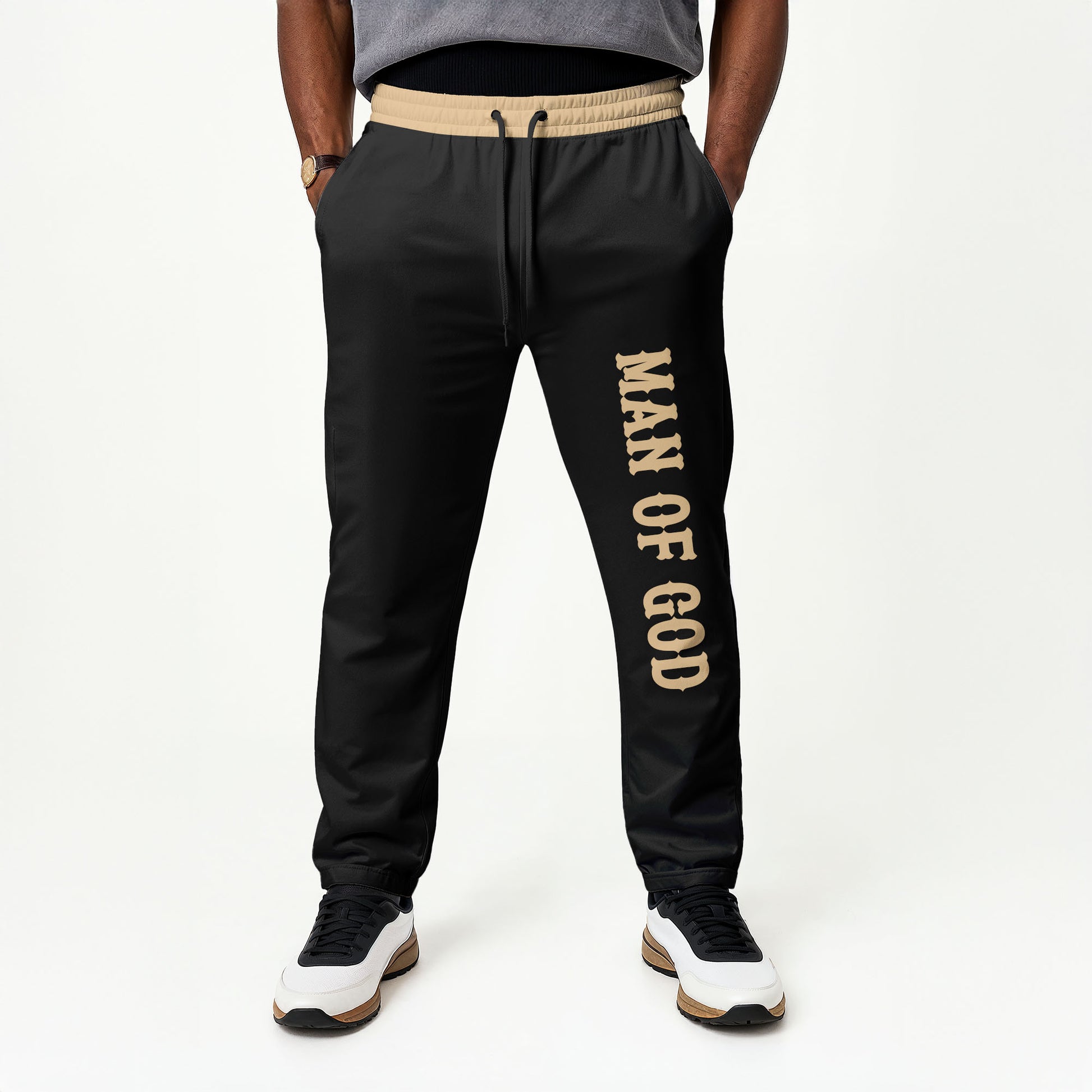 Design: Sleek black joggers with bold “MAN OF GOD” lettering along the leg — a clean, powerful reminder of identity and devotion.