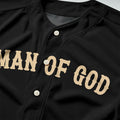 Front (Jersey): Classic baseball silhouette with striking “MAN OF GOD” lettering — a declaration of devotion, leadership, and belief.