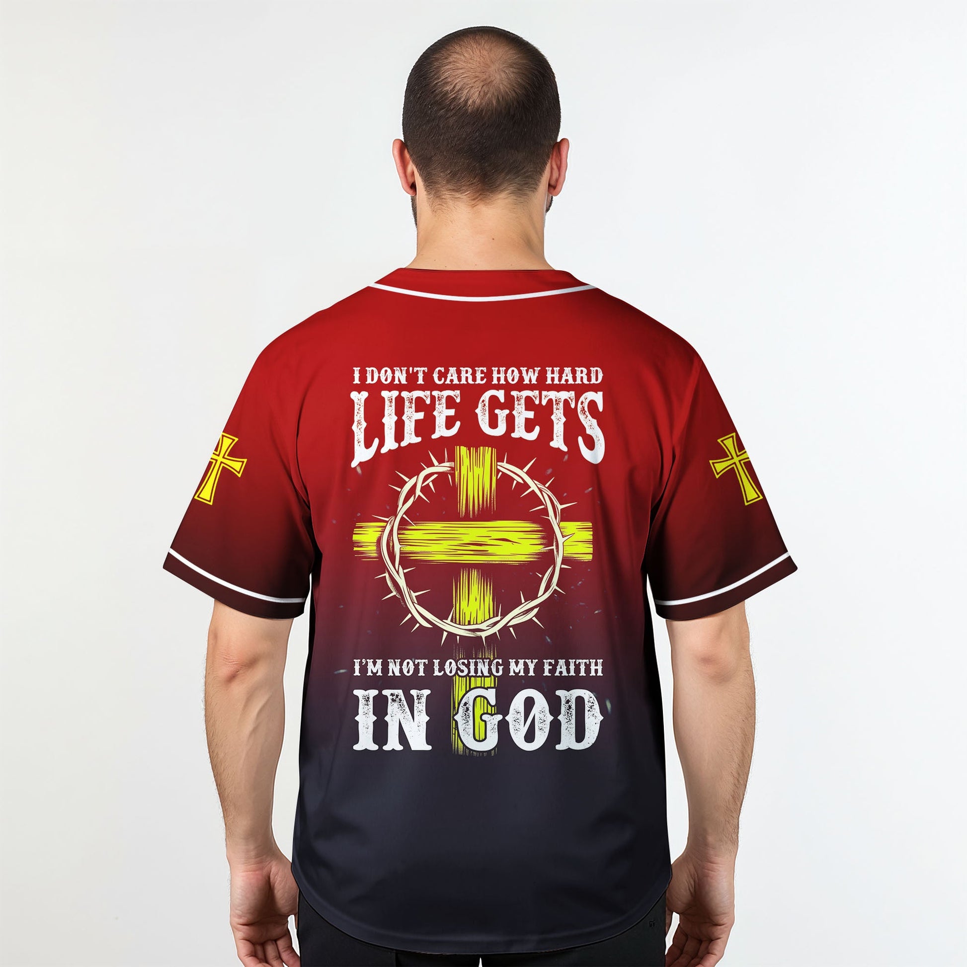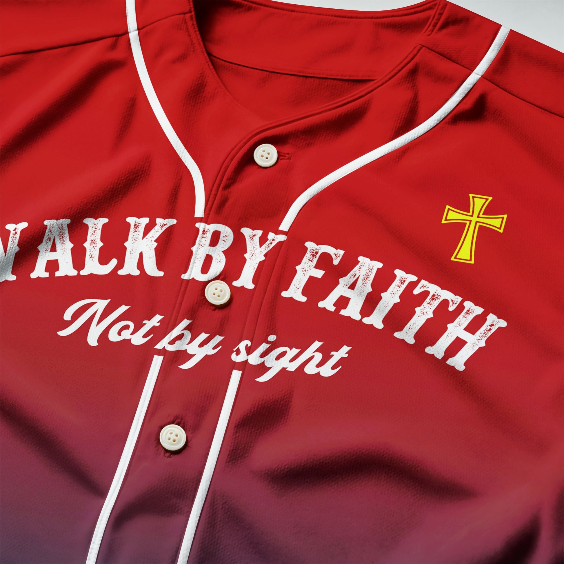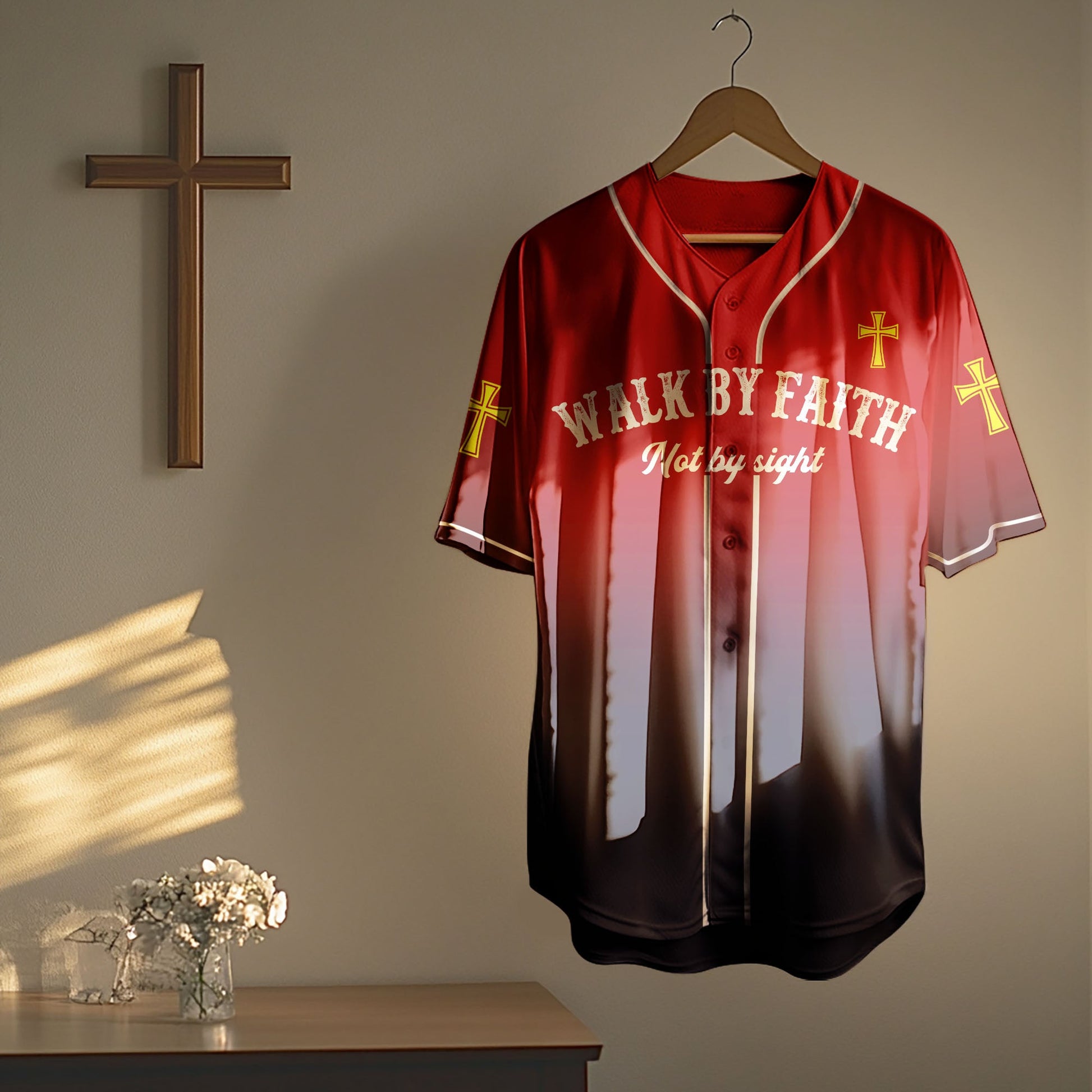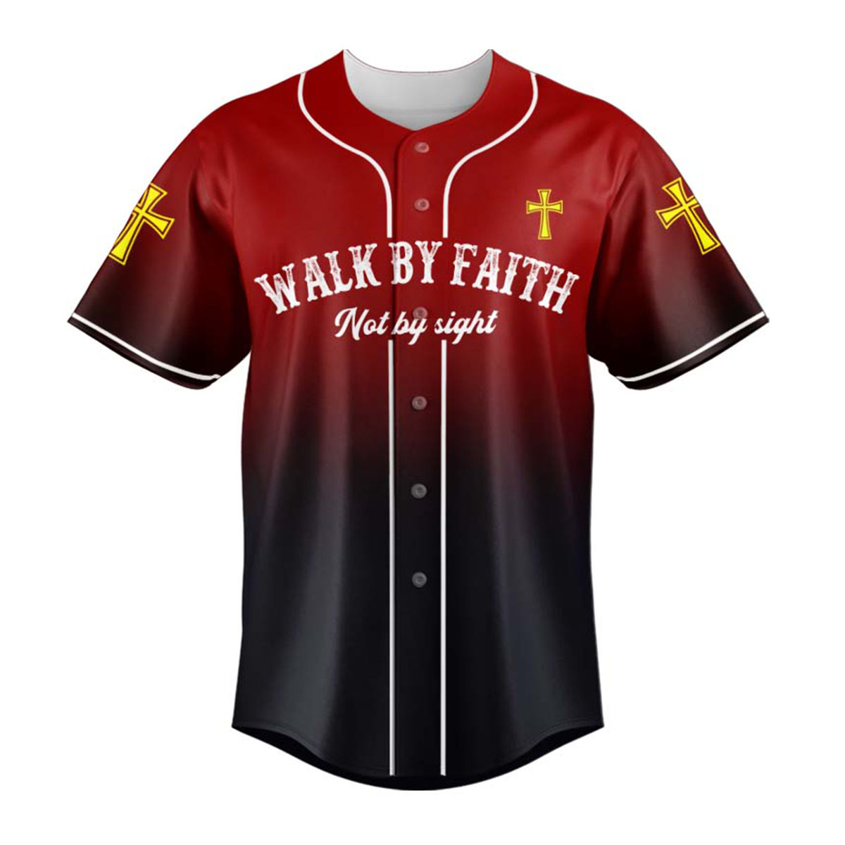 The “Faithwalk” Baseball Jersey blends modern streetwear with a powerful message of faith. Designed in a bold red-and-black gradient, the front proudly declares “Walk by Faith, Not by Sight” with golden cross accents, while the back delivers the statement “I don’t care how hard life gets – I’m not losing my faith in God” framed by a crown of thorns and cross graphic. Made with breathable, lightweight fabric, this jersey is perfect for everyday wear or as a statement piece to showcase your devotion in style.