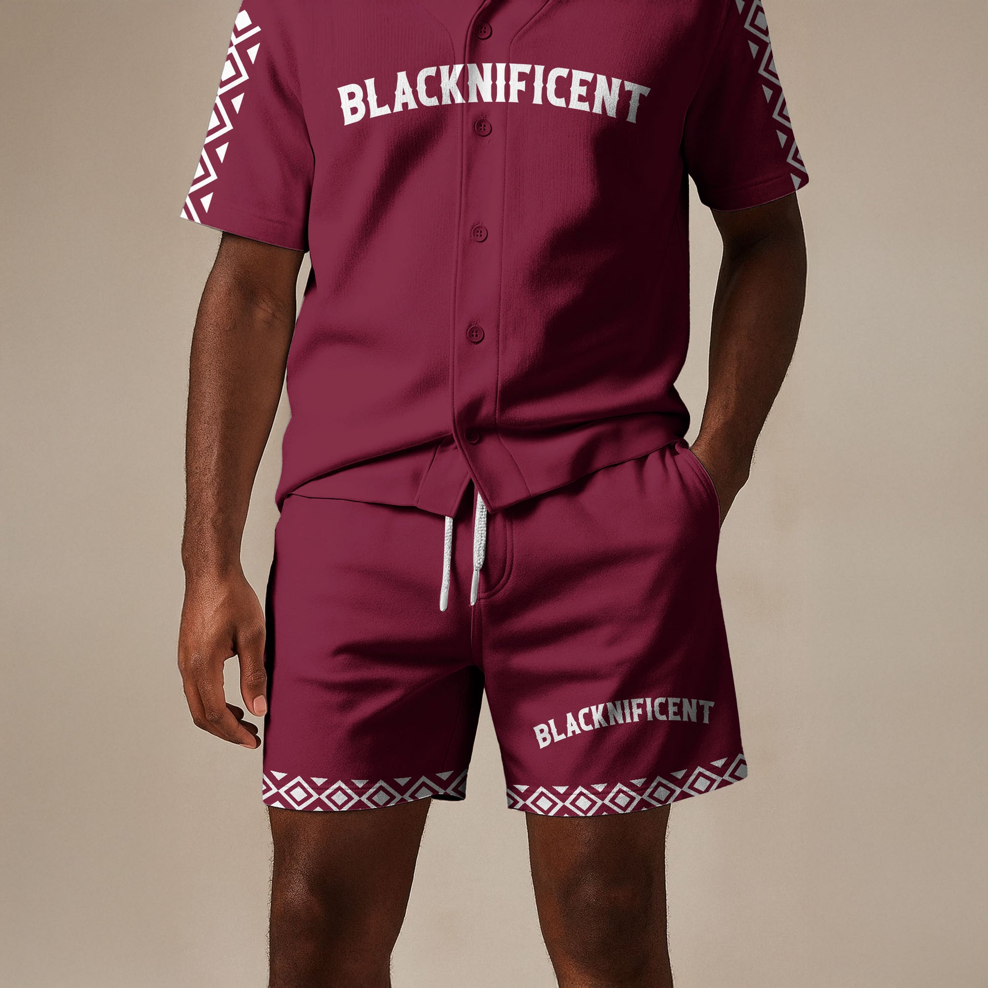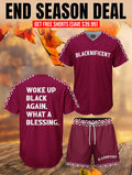 Celebrate Black excellence every day. This maroon jersey & shorts combo features bold tribal-inspired details and a statement of pride: “Woke Up Black Again, What A Blessing.”