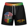 A powerful tree spans the shoulders—its crown draped in the American flag, its roots pulsing in Pan-African colors. Underneath, the message speaks for every brother who knows where he comes from: