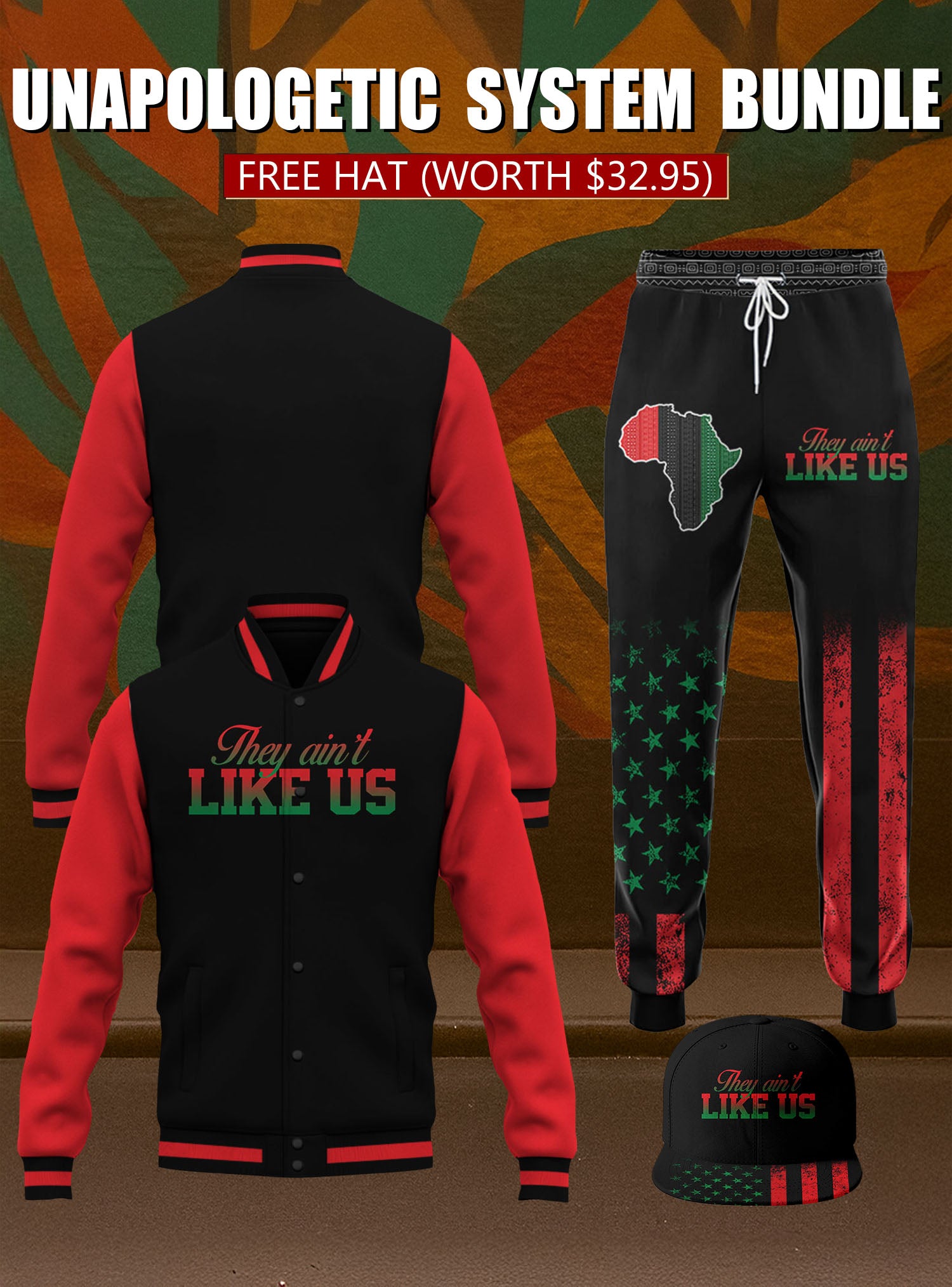 🧥 Jacket: “They ain’t LIKE US” statement across the chest, accented by striking red sleeves and bold black body — a powerful Pan-African colorway.