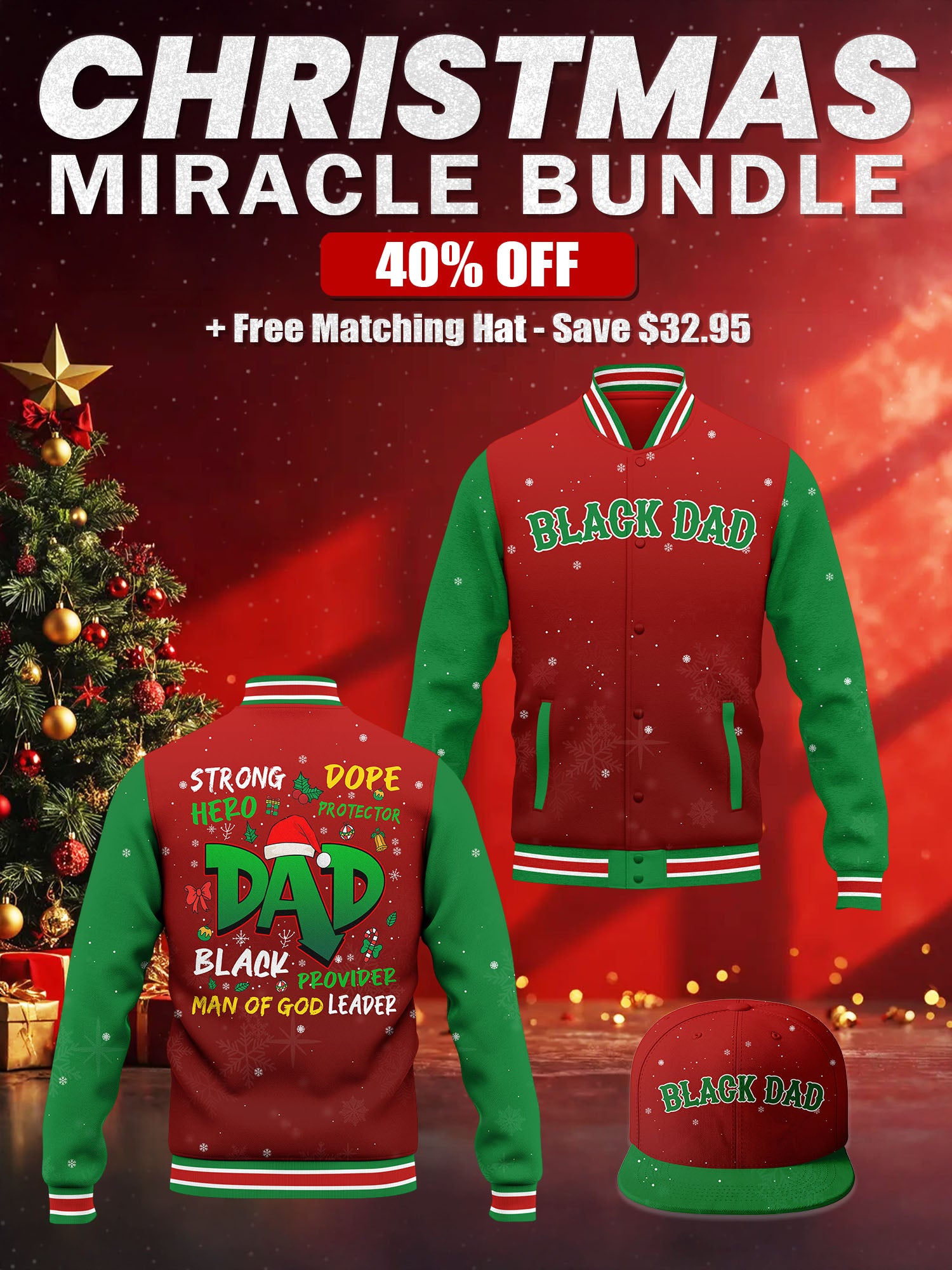 The “Black Dad” Baseball Jacket + Hat Bundle was made to honor the men who lead with love, strength, and wisdom — fathers who stand tall for their families and set the standard with faith and pride.
