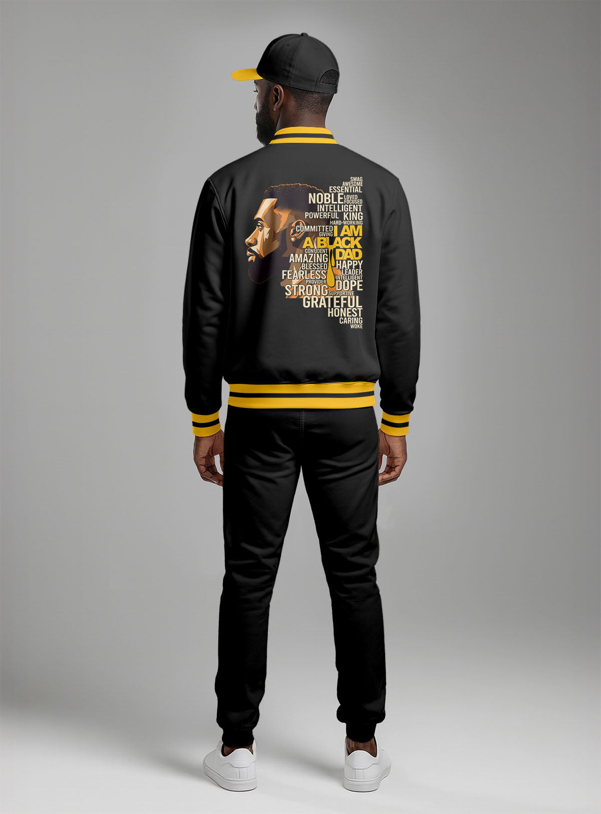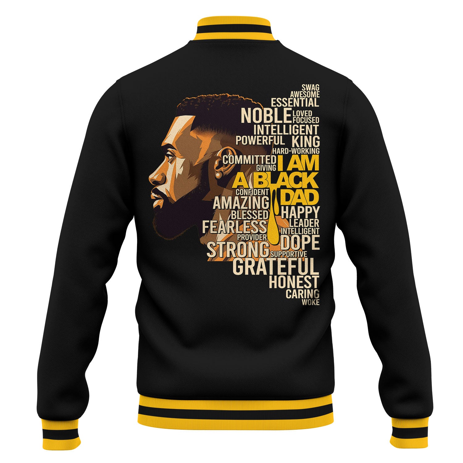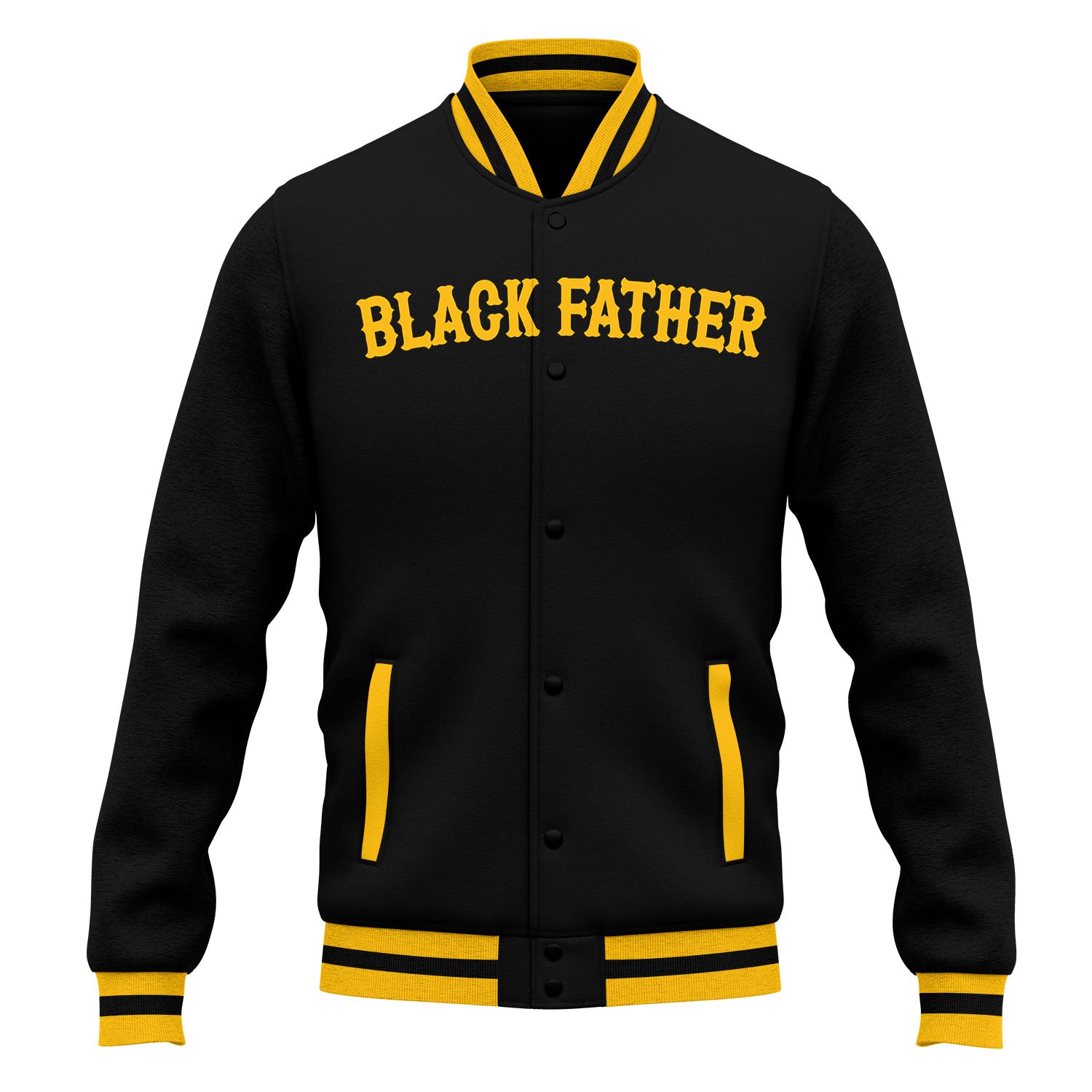 🧥 Jacket Design: Jet-black body with white contrast sleeves and bold gold “BLACK FATHER” lettering across the chest. A regal crown-and-cross emblem on the back symbolizes strength, guidance, and God-given leadership.