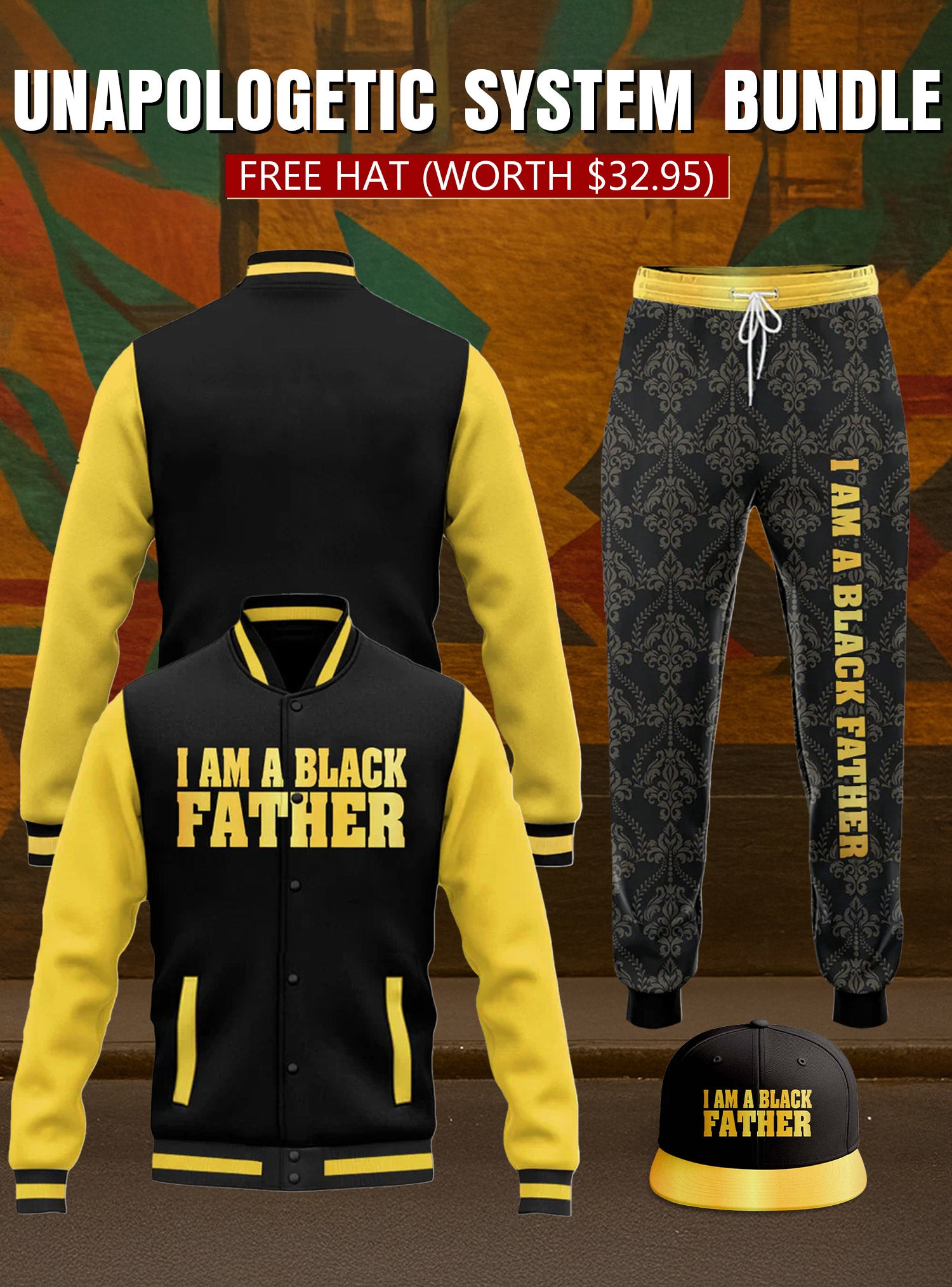π§₯ Varsity Jacket: Classic black and gold contrast with the unapologetic statement βI AM A BLACK FATHERβ front and center.