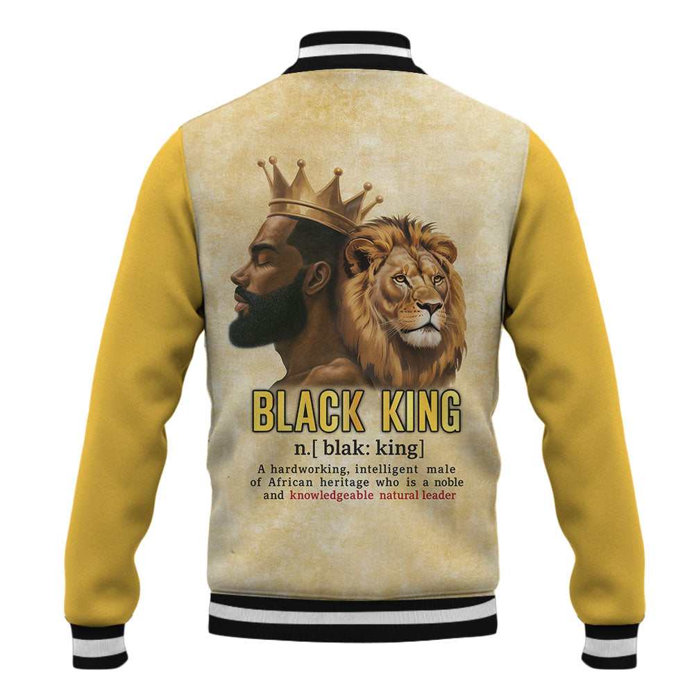 Front (Jacket): Classic varsity silhouette with striking āBLACK KINGā lettering ā declaring identity, leadership, and power.