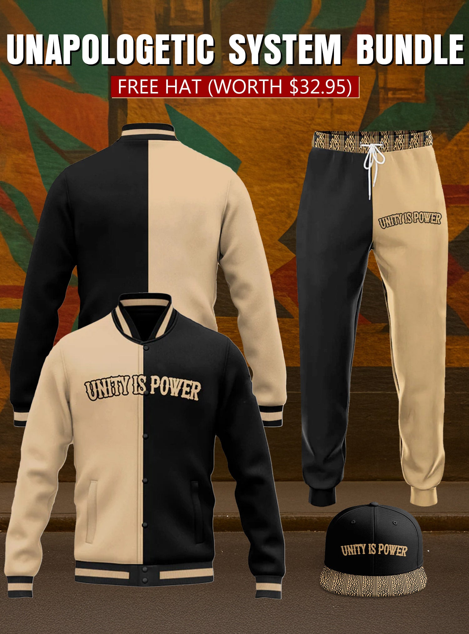 🧥 Varsity Jacket: Unique half-black, half-cream design with a striking “UNITY IS POWER” statement across the chest — a true conversation starter.