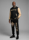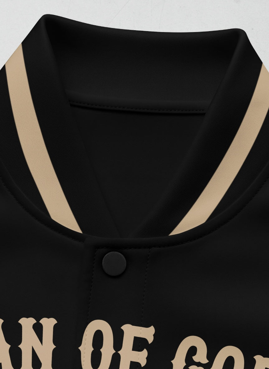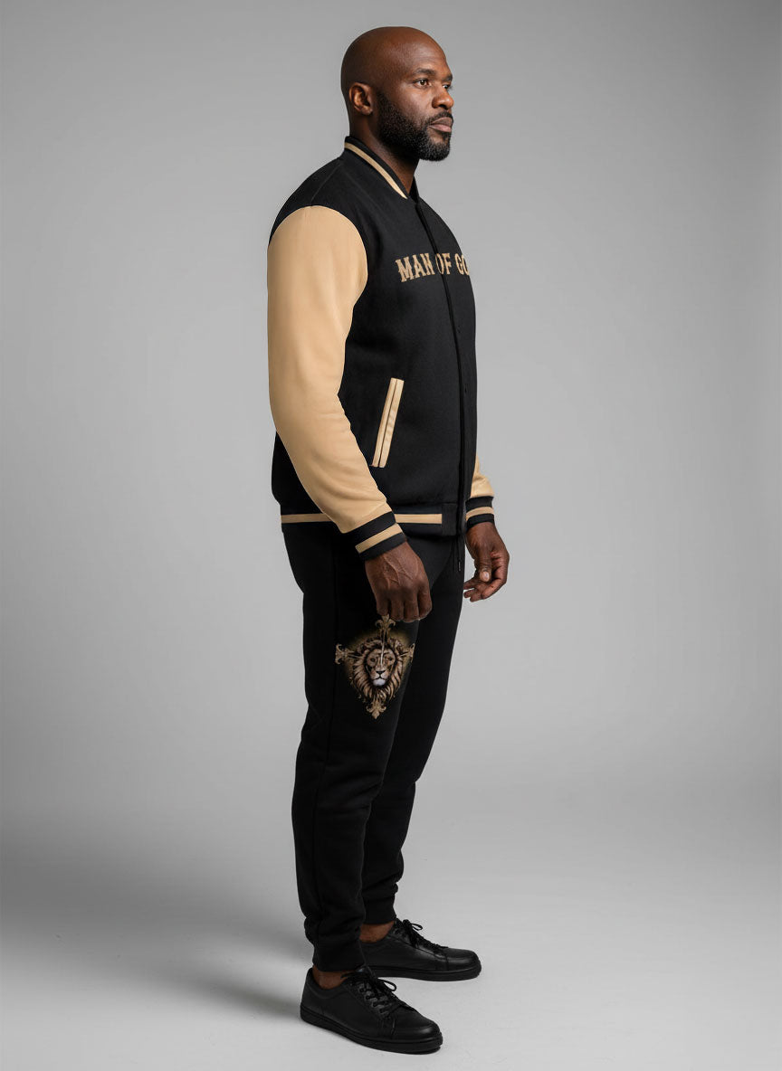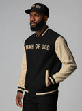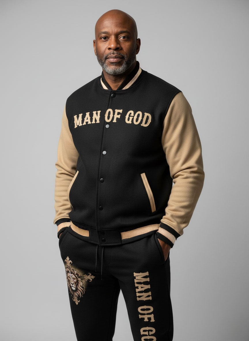 The "Man of God" Baseball Jacket & Hat Bundle was made for the man who doesn’t just believe—he lives his faith out loud. Cloaked in bold black and cream, it carries the powerful words “Man of God” across the chest—a declaration, not decoration.
