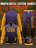 🧥 Varsity Jacket: Purple-to-black gradient with gold sleeves and “BLACK FATHER” statement in regal gold lettering. A head-turning design inspired by royal power and cultural pride.
