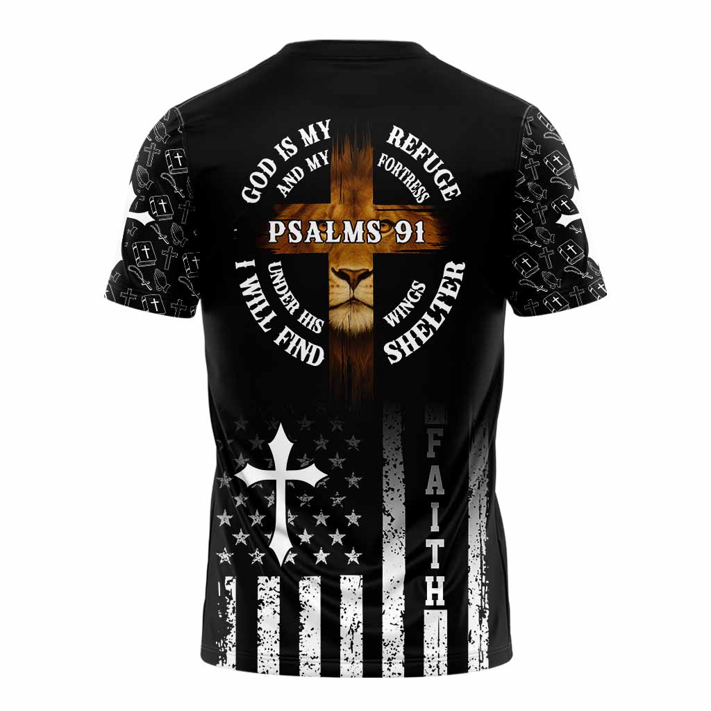 The “Refuge” T-shirt carries a bold statement of faith and strength. Featuring Psalms 91—“God is my refuge and my fortress; under His wings I will find shelter”—this shirt is a wearable reminder of divine protection. Designed with striking cross and lion artwork, it delivers a fearless look while keeping you rooted in God’s word. Lightweight, comfortable, and versatile, this T-shirt is perfect for daily wear or pairing with other pieces from the “Refuge” Collection.