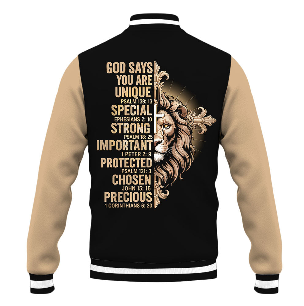 🧥 Jacket: “MAN OF GOD” front print; back features a majestic lion and uplifting Bible verses that affirm your identity: Unique. Strong. Chosen. Precious.