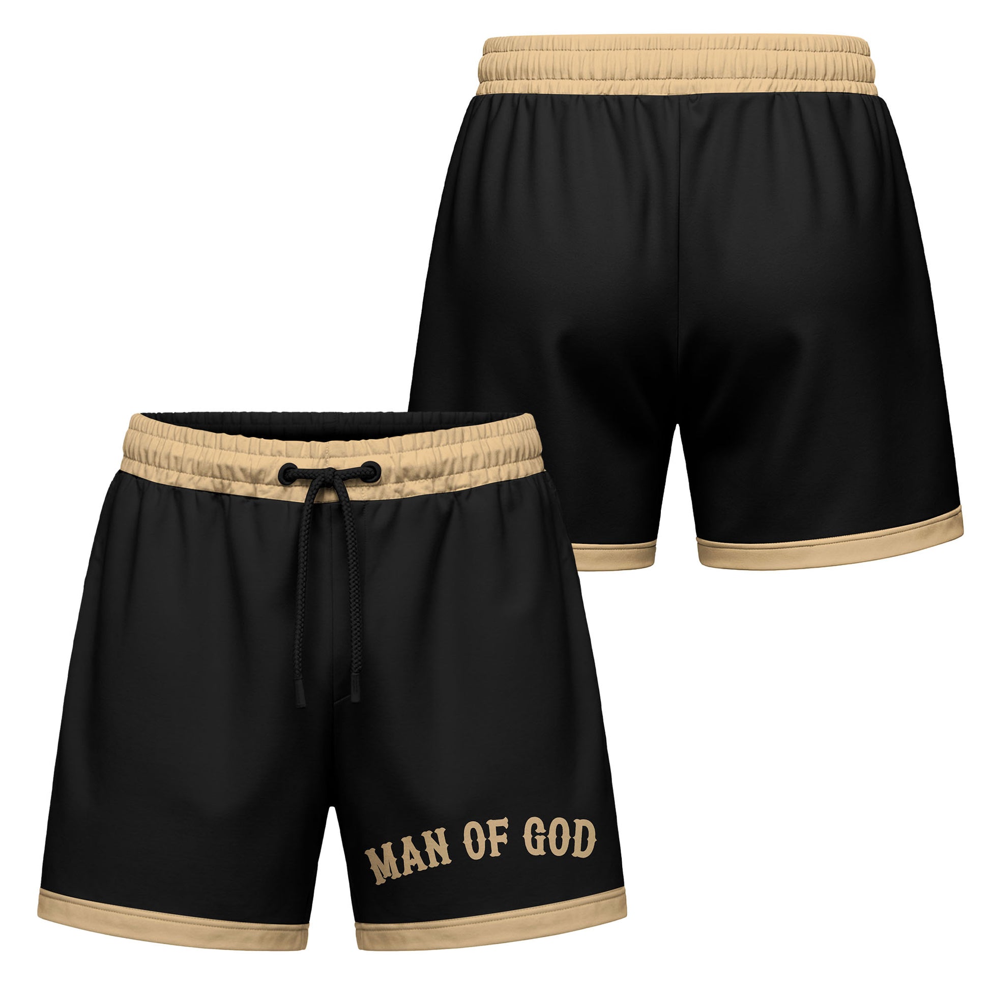 Design: Clean black shorts with bold “MAN OF GOD” lettering on the leg — a simple yet powerful statement of identity and belief.