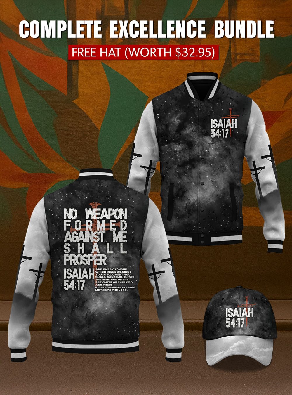 Protected by faith. Covered by His promise. The “No Weapon Christian” varsity jacket + matching hat set is a bold declaration of Isaiah 54:17 — “No weapon formed against you shall prosper.”