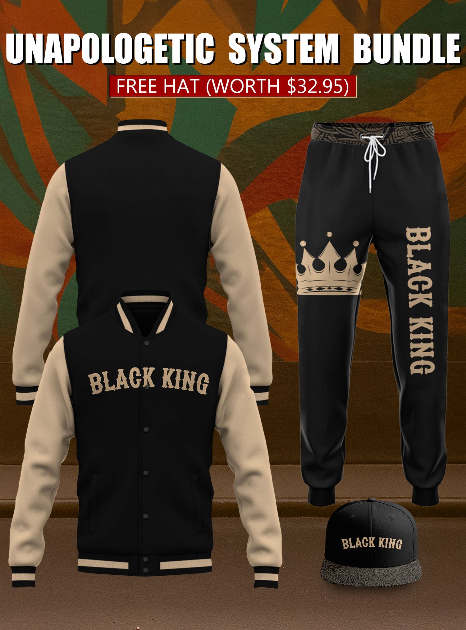Step into your royal energy — this fit was made for a Black King who moves with purpose and pride. This bundle blends classic varsity style with bold cultural symbolism, creating a look that’s powerful, clean, and unapologetically regal.