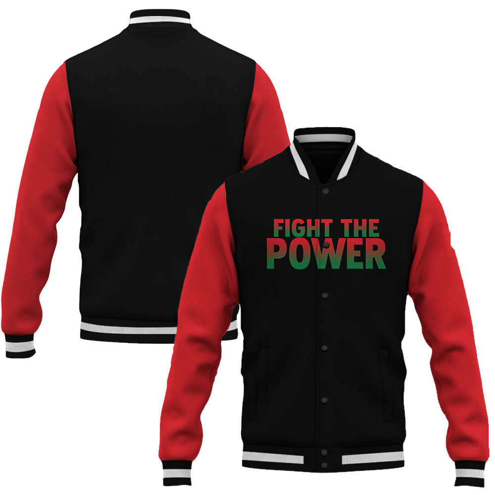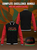 Front (Jacket): Classic varsity cut with “POWER PRIDE” lettering — a declaration of unity, confidence, and cultural strength.